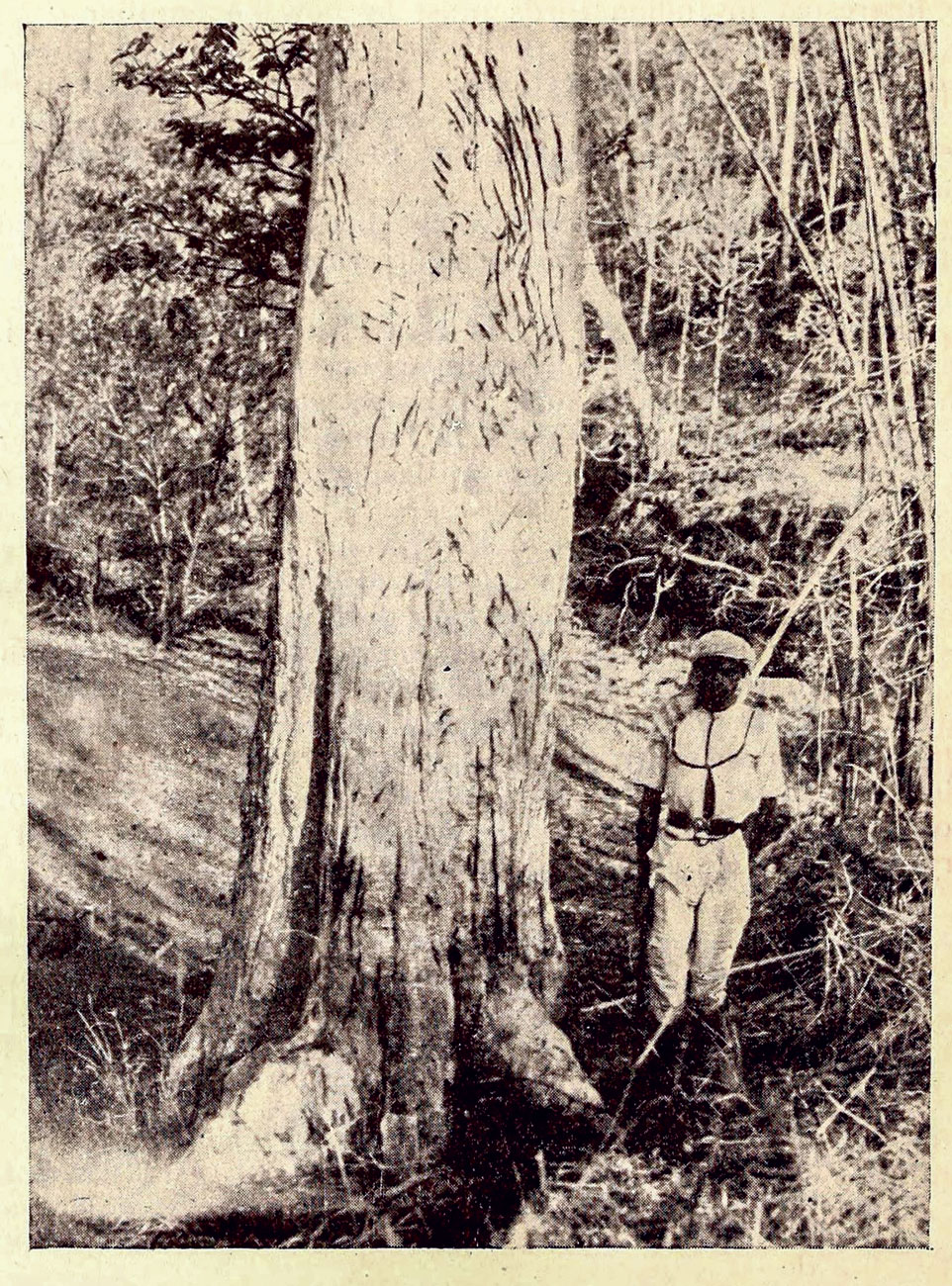 A c.1941 photo by C.E. Hewetson showing tiger scratch marks on an arjan tree somewhere in the Betul forest division. With the top mark at 3.2 m. above the ground, these claw marks give a clear sense of the tiger's power when visualised in its stance. Photo: C.E. Hewetson/Bombay Natural History Society.