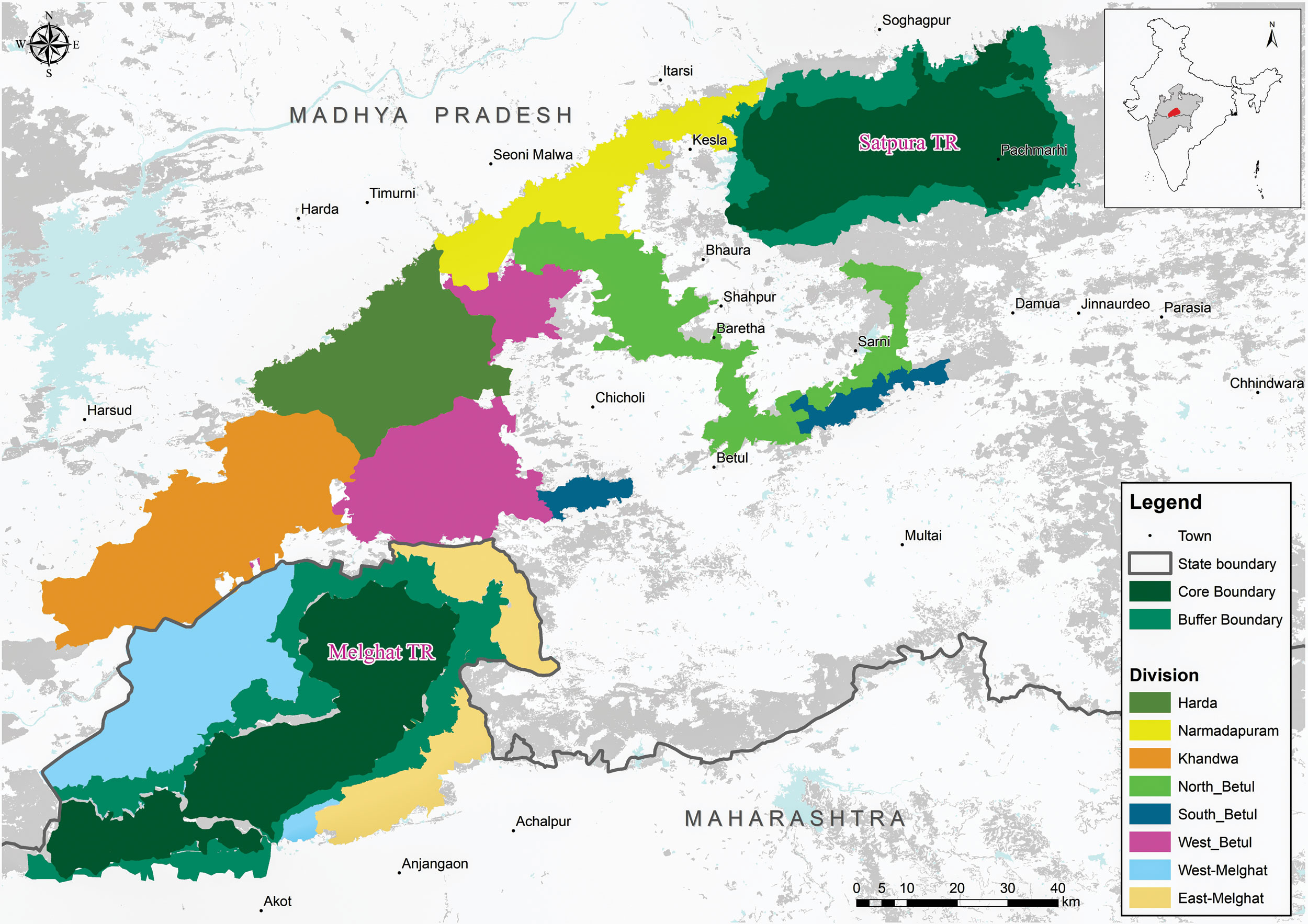 Map showing the division-wise break-up of the Satpura-Melghat Corridor. Photo: WCT.