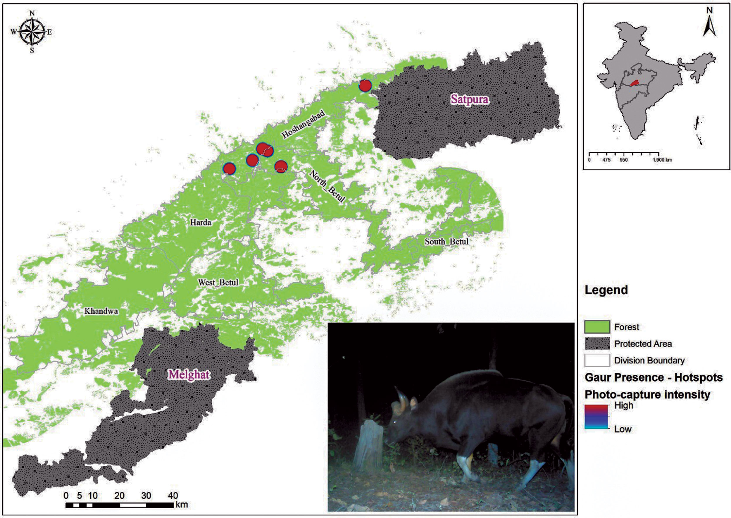 Map showing hotspots of gaur presence in the Satpura-Melghat Corridor. Photo: WCT.
