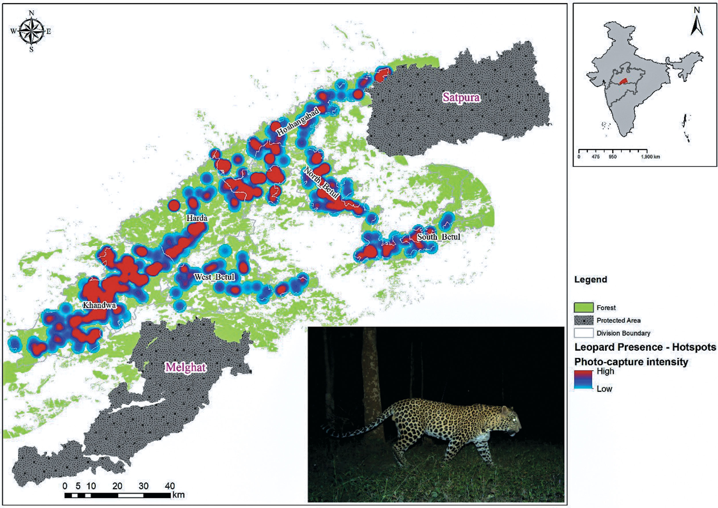 Despite the intense anthropogenic pressure, linear infrastructure and other disturbances throughout the Satpura-Melghat corridor, leopards were found to be fairly well distributed across this corridor's landscape. Photo: WCT/MPFD.