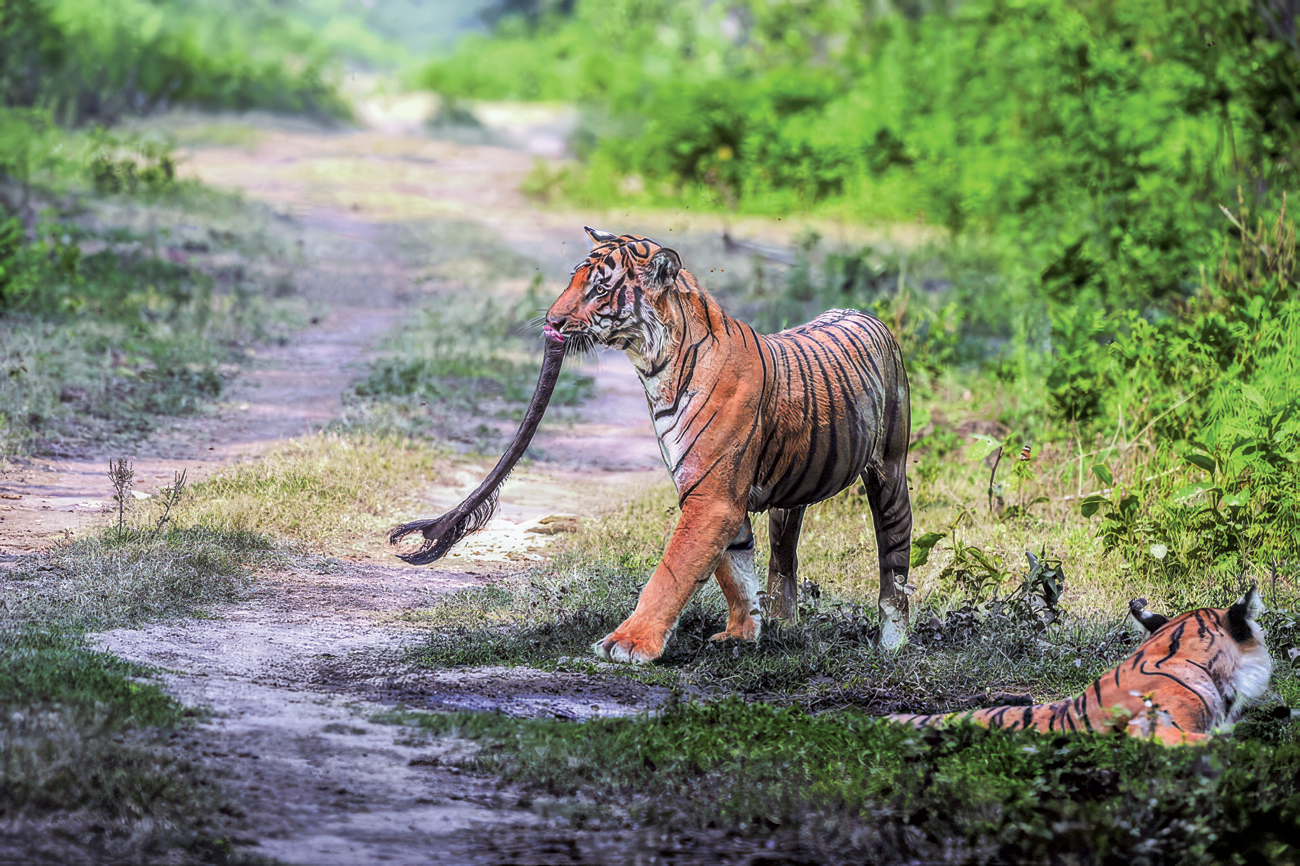 Tigers, though solitary and supreme predators with finely tuned hunting strategies, are not above scavenging. Opportunistic by nature, they may steal kills from other carnivores or feed on carcasses when available. In April 2022, a tigress was observed feeding on the naturally deceased carcass of an elephant in Corbett National Park — an unusual but not unheard-of behaviour in the wild. Photo: Dr. Samir Sinha.