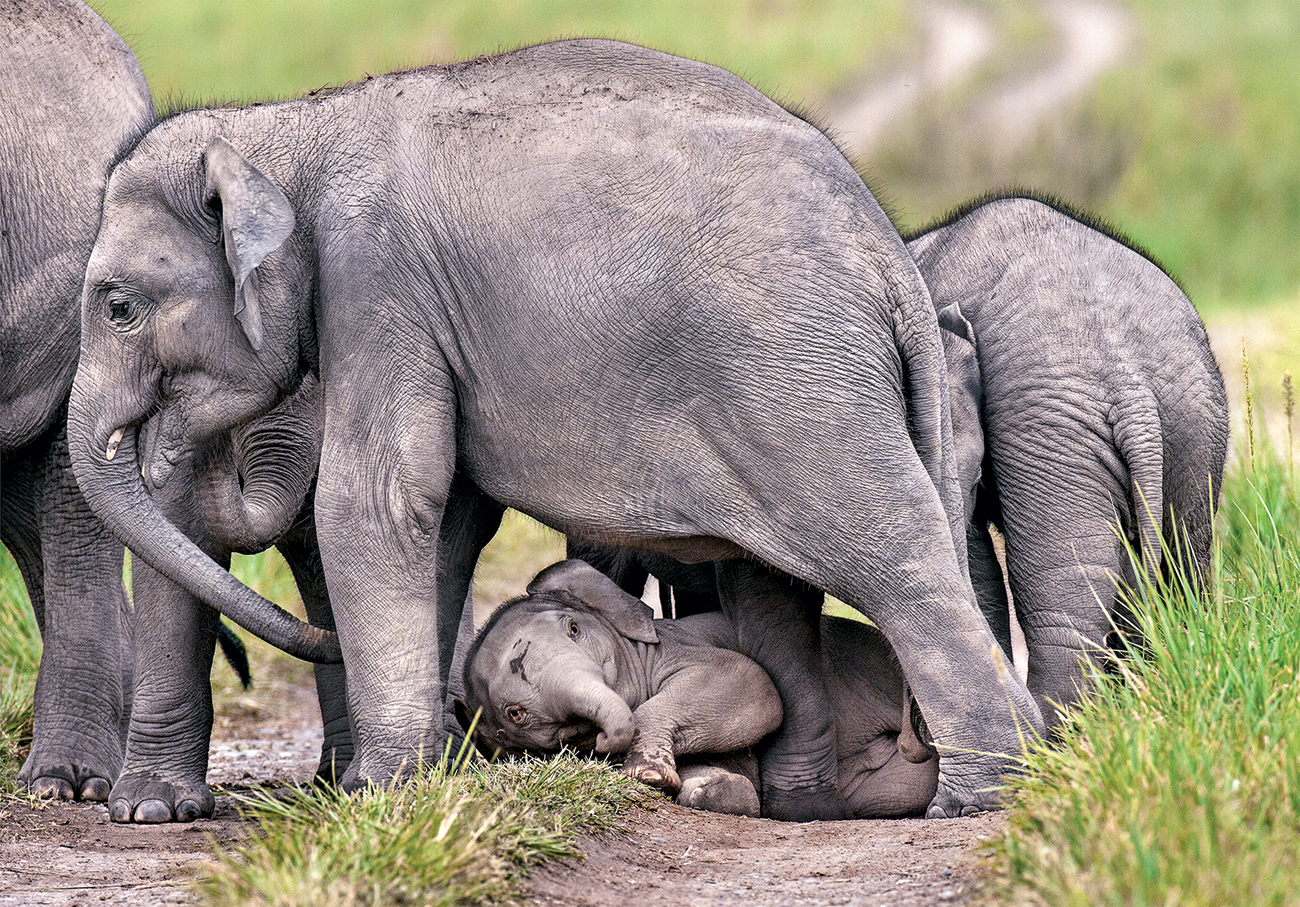 An exhausted baby elephant, resembling the beloved figure of young Ganesh, pauses for a moment’s respite. At the same time, elders stand guard, watchful and protective, until the herd prepares to continue their journey. Photo: Rajesh Bedi.