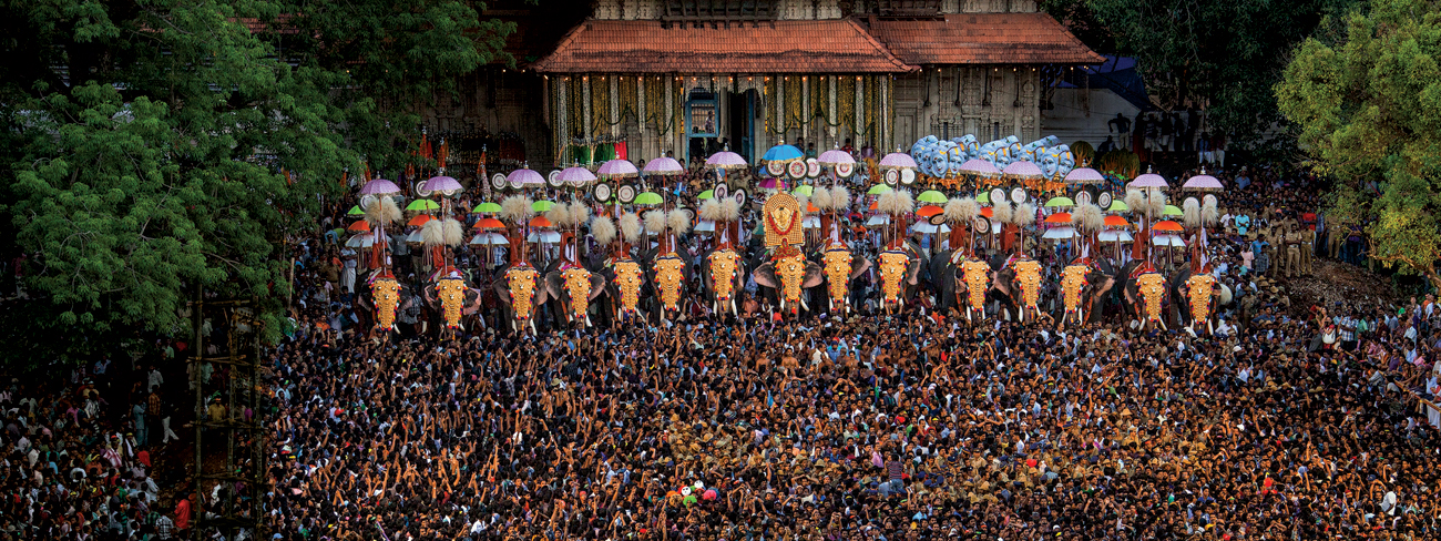 The highlight of Pooram is undoubtedly the Kudamattam ritual, typically held in the evening when the temple grounds, roofs, and adjacent balonies are thronged by approximately one million spectators. Photo: Rajesh Bedi.