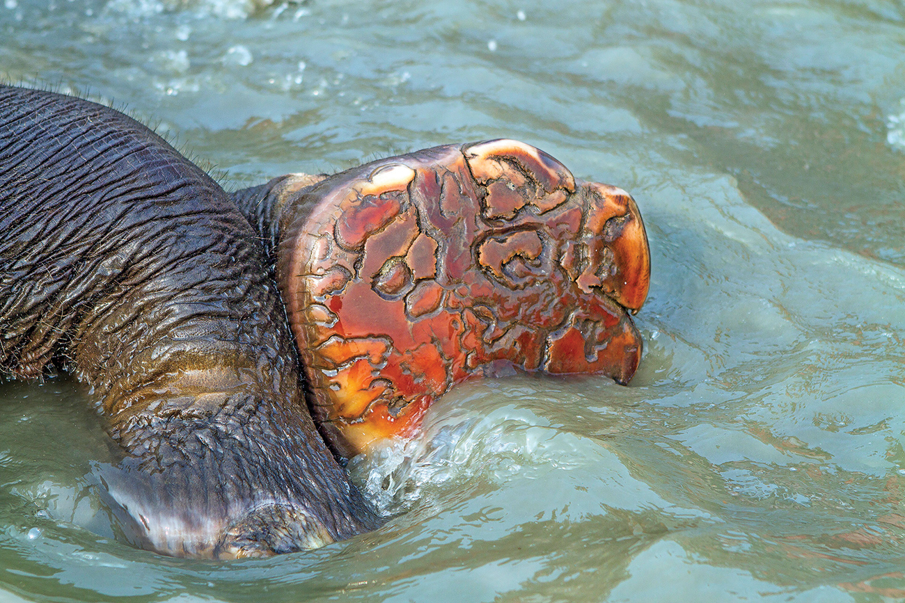 In the clear river water, the elephant’s soles reveal their ridged, grooved texture, designed to cushion weight, grip the ground, and provide steady footing. Photo: Rajesh Bedi.