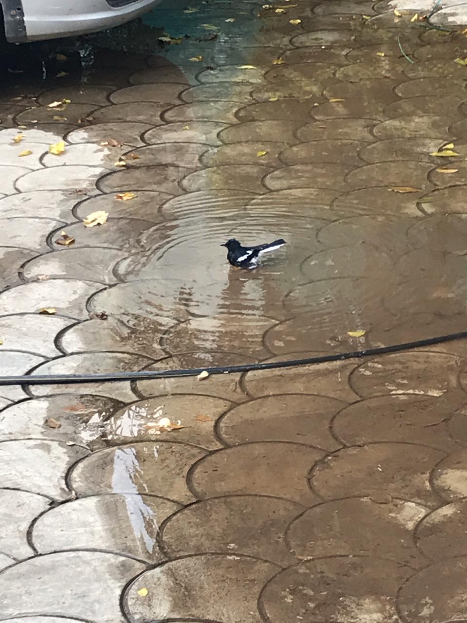An Oriental Magpie Robin plays in a puddle. Photo: Dhruv Mor.