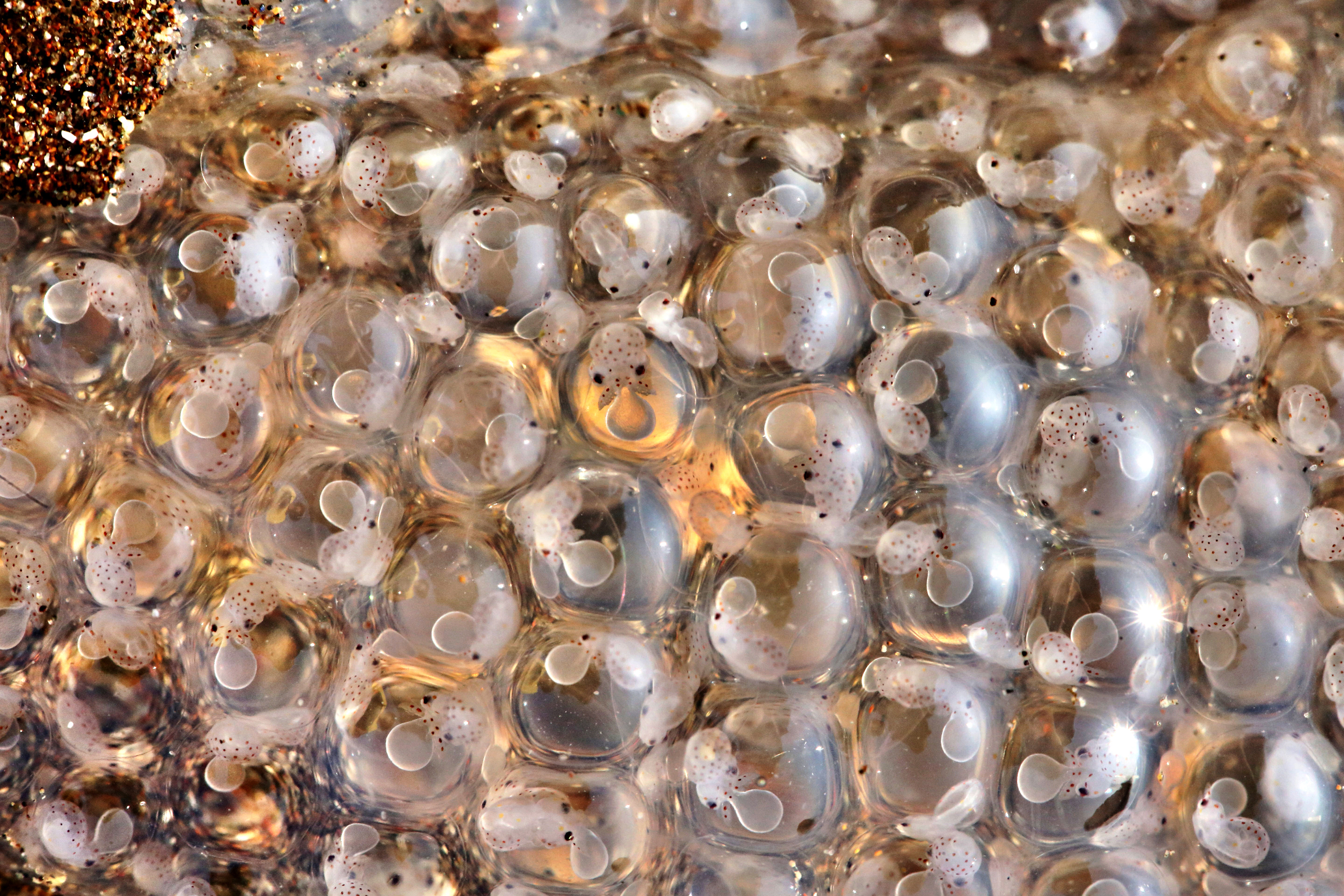 Post fertilisation, her eggs were deposited in strings, by creating a protective ‘funnel’ formed using her eight arms. The community egg-mass seen here was photographed in the coastal town of Vasai in Palghar, Maharashtra, where finger-like projections safely anchor them to the sandy substrate. Squid eggs harden on contact with sea water and what we see here are paralarvae of pencil squids (Longinidae), less than a week old, with some body features such as chromatophores, tentacles and eyes already visible. They will soon venture into the open ocean when their yolk sacs form the remaining body parts, vital to their survival in the company of sharks, dolphins, whales, birds, fish, and humans (in search of calamari). By then they will also have formed tentacles armed with hooks and suckers to trap their prey.