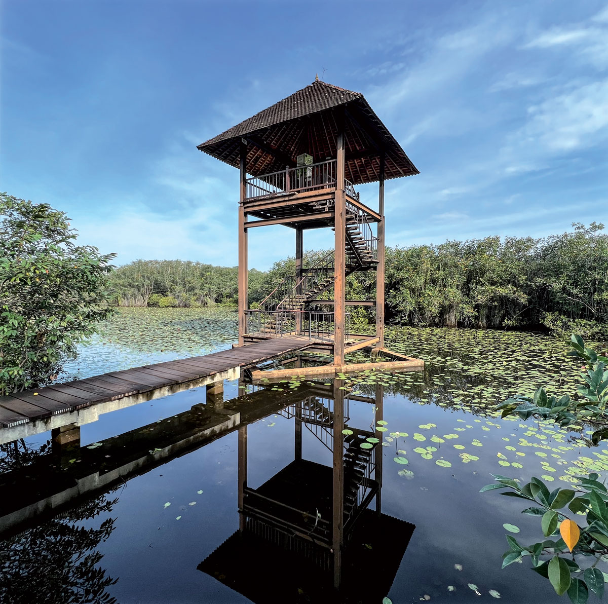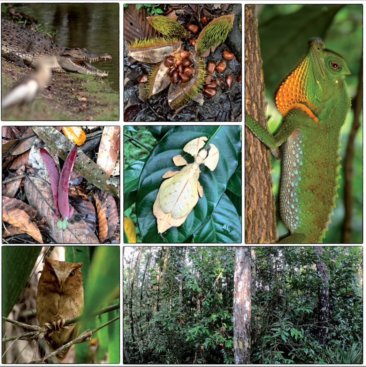 CLOCKWISE FROM UPPER LEFT Saltwater crocodile Crocodylus porosus in Colombo’s Weli Park, an urban wetland that shows clear evidence of unintentional rewilding in the heart of Sri Lanka’s capital city. Seeds of Cullenia ceylanica, an endemic late successional lowland rainforest species that will only establish itself once restoration is well underway. Lyre-nosed lizard Lyriocephalus scutatus, a flamboyant Sri Lankan endemic that the author found in a degraded set-zone forest undergoing succession and restoration. Pinus caribaea plantation being overtaken by site-specific native species in the successful trial plot set up by Professor Nimal Gunatilleke and others on the north-west edge of Sinharaja. Serendib Scops Owl Otus thilohoffmanni at a day roost in recovering plantation/secondary forest outside of the Sinharaja core zone. Winged seed of Dipterocarpus zeylanicus, one of the late-successional species that is widely planted in restoration plots in the Sinharaja area. Leaf insect (most likely Phyllium bioculatum) found in restored and recovering semi-evergreen forest in the Dy Zone near Popham’s Arboretum.