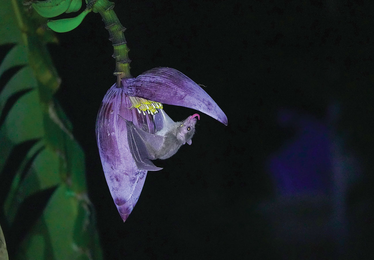 A probable species of fulvous fruit bat Rousettus leschenaultii licks nectar from a banana flower in Uttar Dharamtul, Morigaon, Assam. Photo: Gaurab Talukdar/Sanctuary Photolibrary.