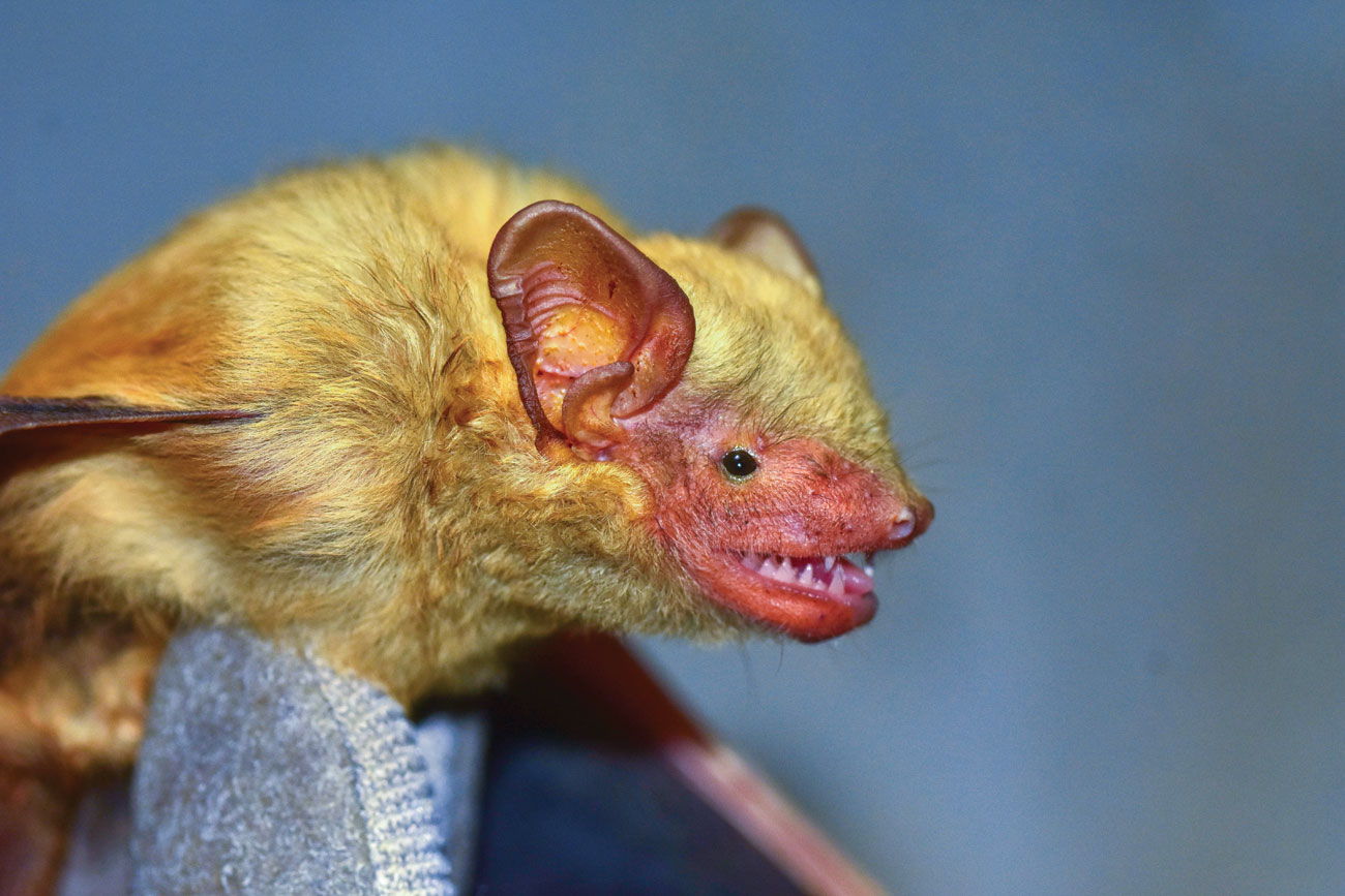 A Tickell’s bat Hesperoptenus tickelli photographed in Meghalaya bares its tiny perfect teeth. This species is one of the few brightly coloured bats found in India. Photo: Rohit Chakravarty.