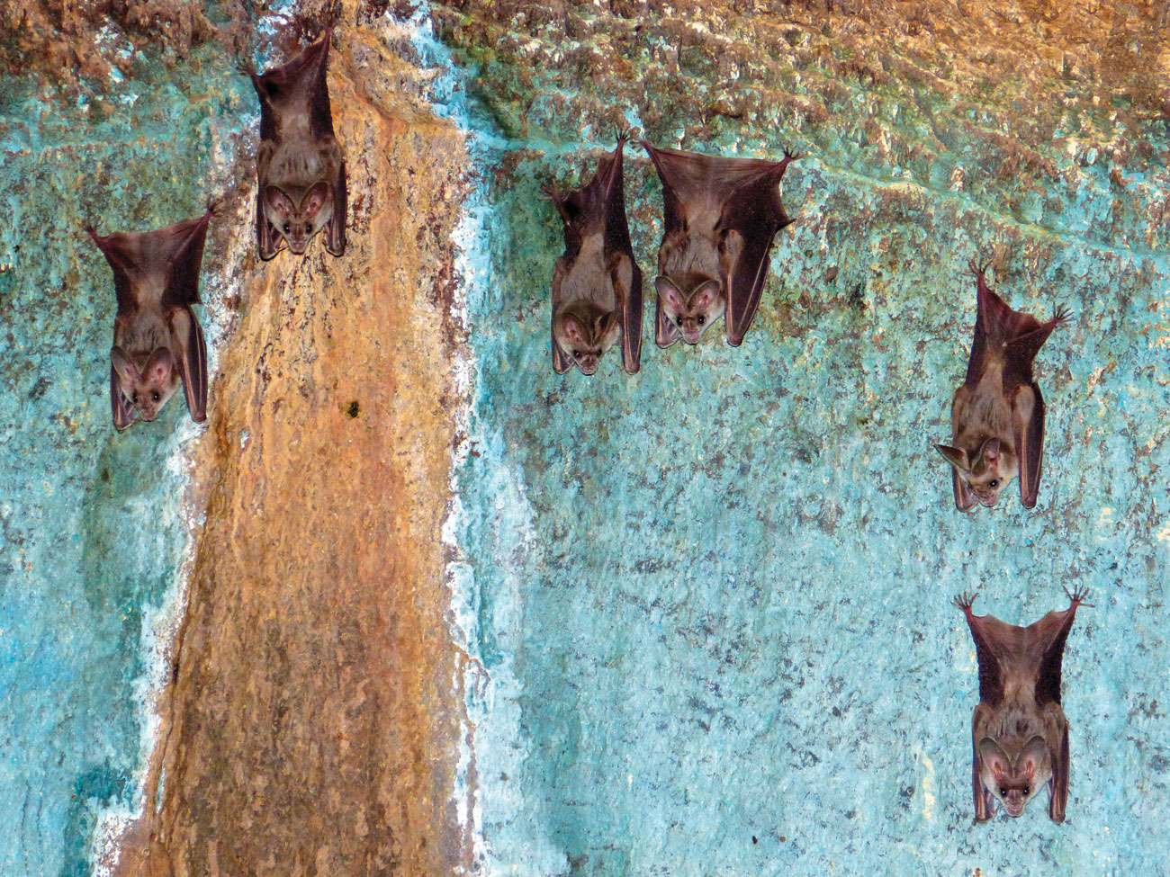 Greater false vampire bats Lyroderma lyra roosting in a temple in Vidarbha, Maharashtra. These bats are one of the few carnivorous bats found in India. Photo: Rohit Chakravarty.