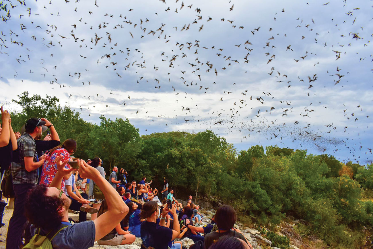 Bat researchers and tourists watching Mexican free-tailed bats Tadarida brasiliensis at Bracken cave, Texas, USA as they emerge at dusk. Bracken cave is home to more than 15 million bats. Photo: Rohit Chakravarty.