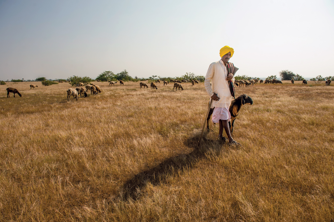 A Dhangar shepherd stands tall with his herd of sheep in Maharashtra. The pastoral communities that depend on these commons – the Dhangar shepherds of the Deccan, the Rabari herders of Kutchh, the Bishnoi of Rajasthan – find their grazing lands shrinking without any formal recognition of what is being lost. Photo:Kalyan Varma.