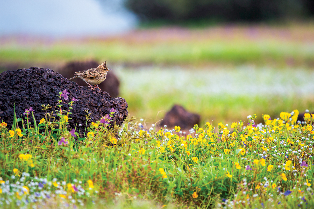Grasslands in India are remarkably diverse. They range from the semi-arid savannas of western India and the rolling plateaus of the Deccan to the tall alluvial grasslands along Himalayan rivers, shola grasslands of the Western Ghats, and the alpine meadows that bloom briefly under melting snow. Each type is shaped by rainfall, soil, fire, grazing, and seasonal extremes. A Malabar Lark Galerida malabarica sits pretty in the seasonally flowering plateau of Kaas, Maharashtra. Photo:Pushkar Achyute/Sanctuary Photolibrary.