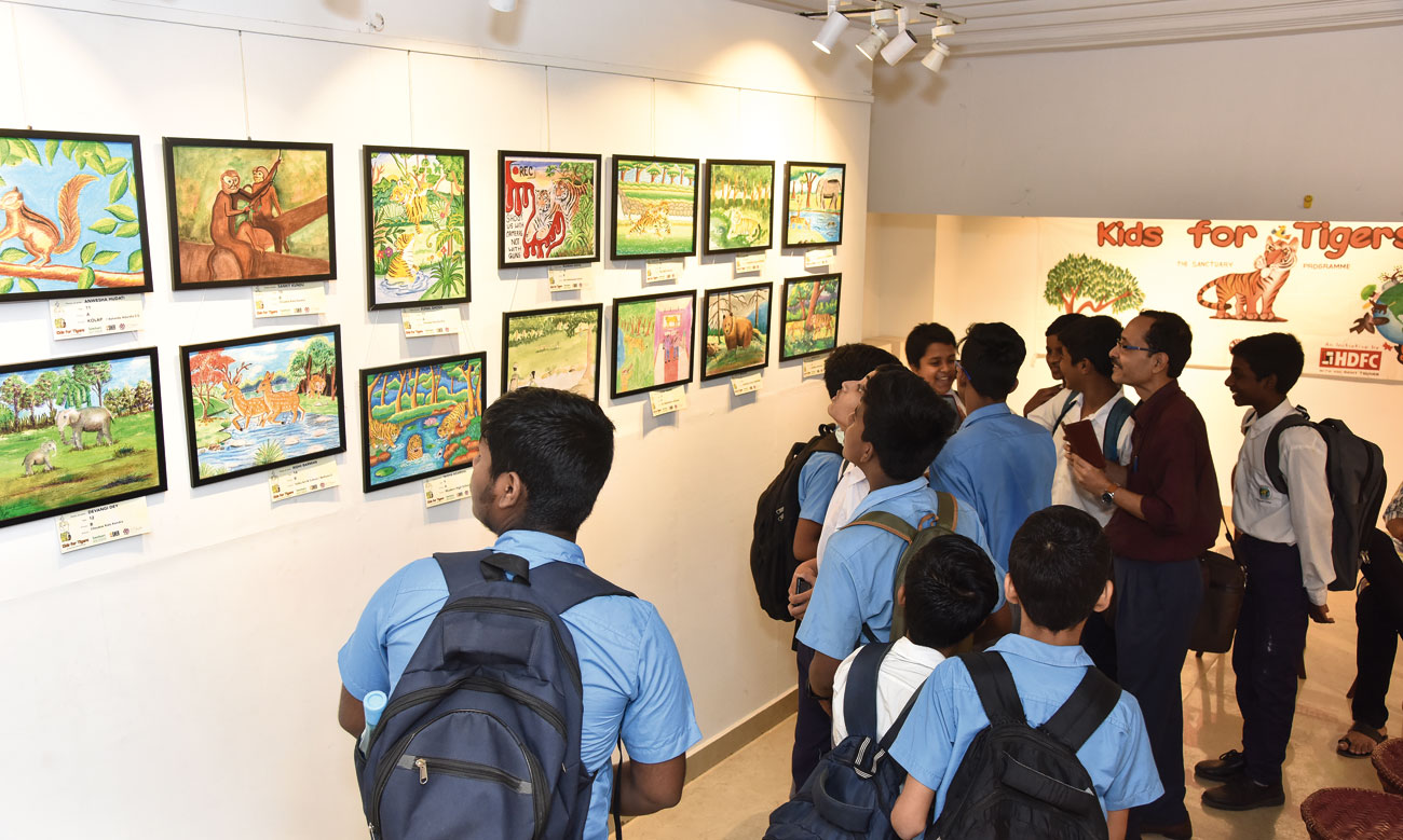 To strengthen the relationship between people and nature ‘Art for the Wild’, an exhibition of children’s paintings and sketches, was held at Gallery Gold in South Kolkata. The objective of the three-day exhibition was to stimulate creativity and spread awareness on the need for wildlife and nature conservation. The exhibition was organised by Sanctuary Nature Foundation’s Kids for Tigers and its Kolkata partners, SHER, an NGO run by the husband-and-wife team of Suchandra and Joydip Kundu. Thanks to the CSR support of H T Parekh Foundation, we were able to hire a popular art gallery where 255 artworks, drawn by Kids for Tigers’ ‘vanar sena’ adolescents (shortlisted from over 1,000 artworks created by children ranging from eight to 16 years) were exhibited.