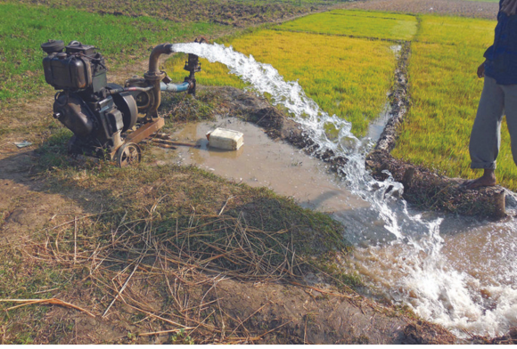 Groundwater being pumped at a farm. Human activities are responsible for 77 per cent of the global ground subsidence, of which 60 per cent is attributed to groundwater extraction. Photo: Suraj Mondal.