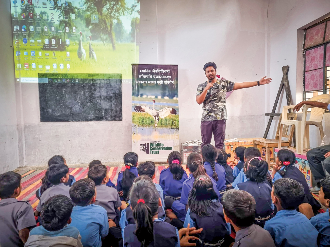 An outreach and sensitisation programme is underway at a school in Gondia, where Shashank Ladekar teaches children that protecting Sarus Cranes is crucial for maintaining healthy wetland ecosystems. Photo Courtesy: Shashank Ladekar.
