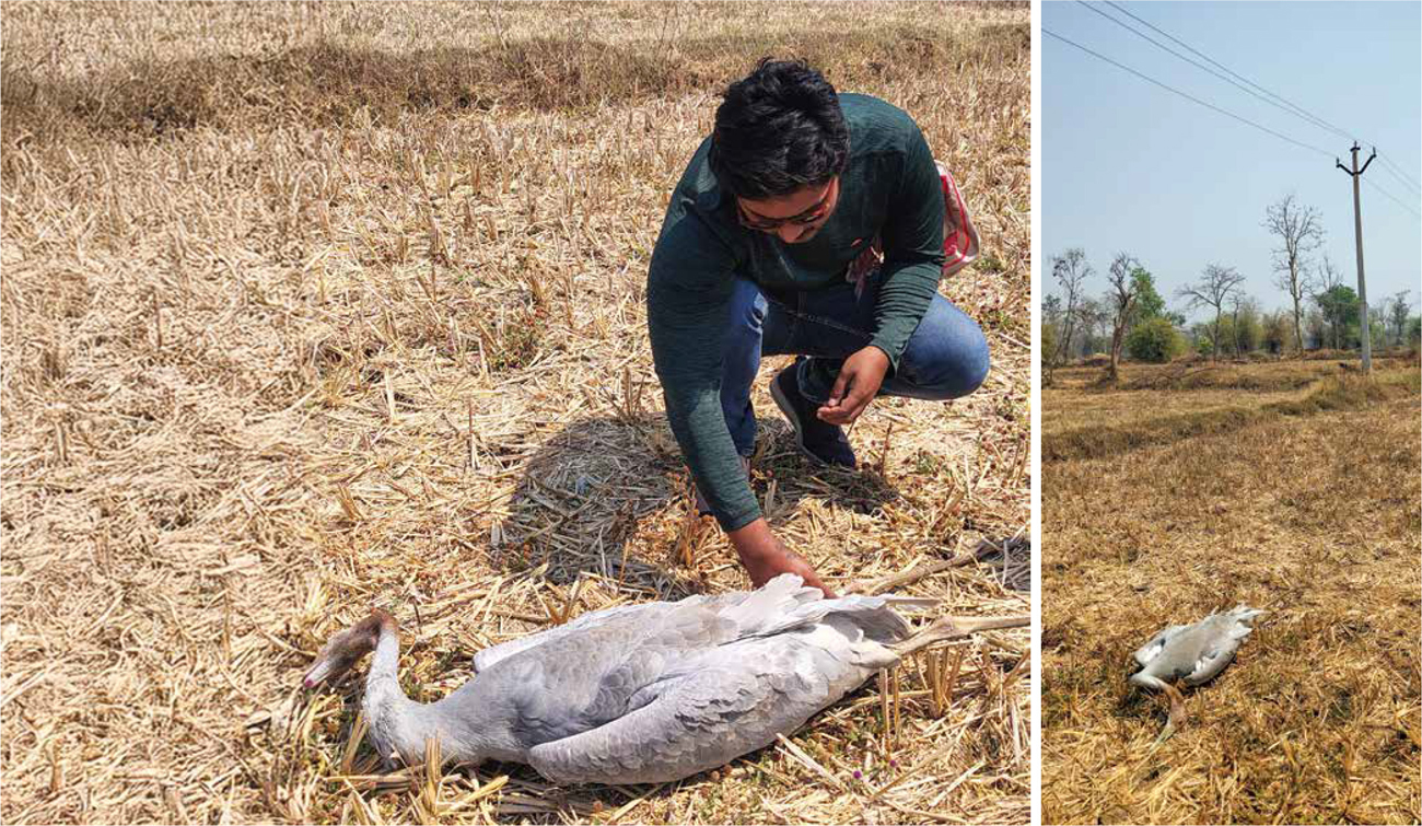 Shashank Ladekar examines the carcass of an electrocuted juvenile Sarus Crane. These young Sarus Cranes died after colliding with overhead wires in Gondia, a tragic reminder of how power lines continue to threaten the species across its range. Photo Courtesy: Shashank Ladekar.