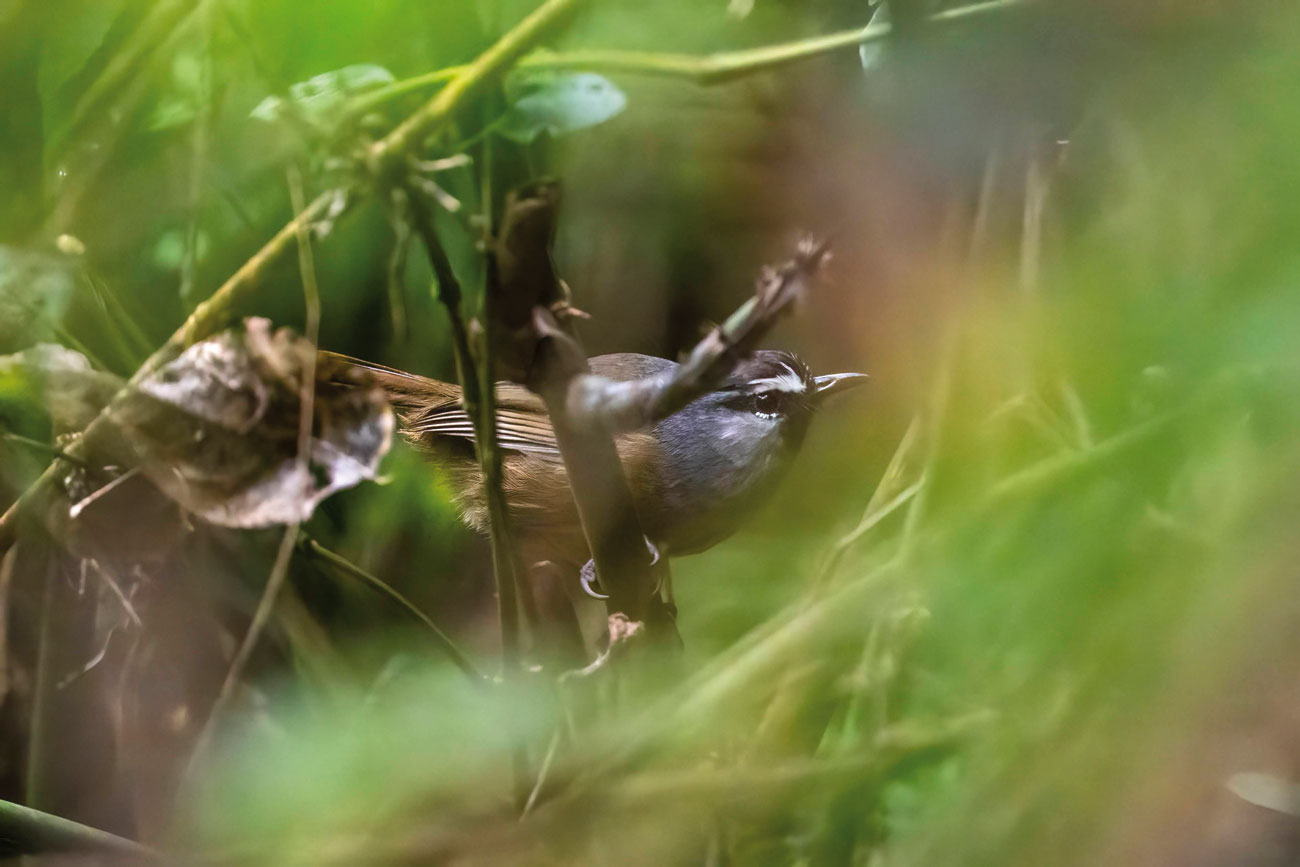 This year, the Ghats experienced unusual weather patterns, with erratic rainfall and a high deficit in many areas. The impact of erratic weather, most likely caused by climate change, on the monsoon-dependent fauna was already palpable, and will likely become even more evident in the coming years. Nonetheless, at David’s property, we had some exciting encounters, including of the Ochlandrae reed frog, large-scaled forest lizard, Anil’s bush frog, hump-nosed pit viper, and the incredibly cryptic Kalpetta yellow bush frog, blending seamlessly into patches of moss and lichen. After bidding adieu to David’s family and team, we set our sights on a mega rarity: the Banasura Chilappan. This highly endemic species had eluded us for years and was only reported from a handful of spots by birders. Also called the Banasura Laughingthrush, one of the least-known bird species in peninsular India, this species calls the Sky Islands (sholas) of subtropical montane forests its home. They are scattered among grasslands and rocky outcrops, found exclusively above 1,400 m. elevation. With meticulous planning and relentless effort, we triumphed, adding this enigmatic bird to our list, alongside some remarkable frogs and caecilians, even spotting a Malabar spiny dormouse.