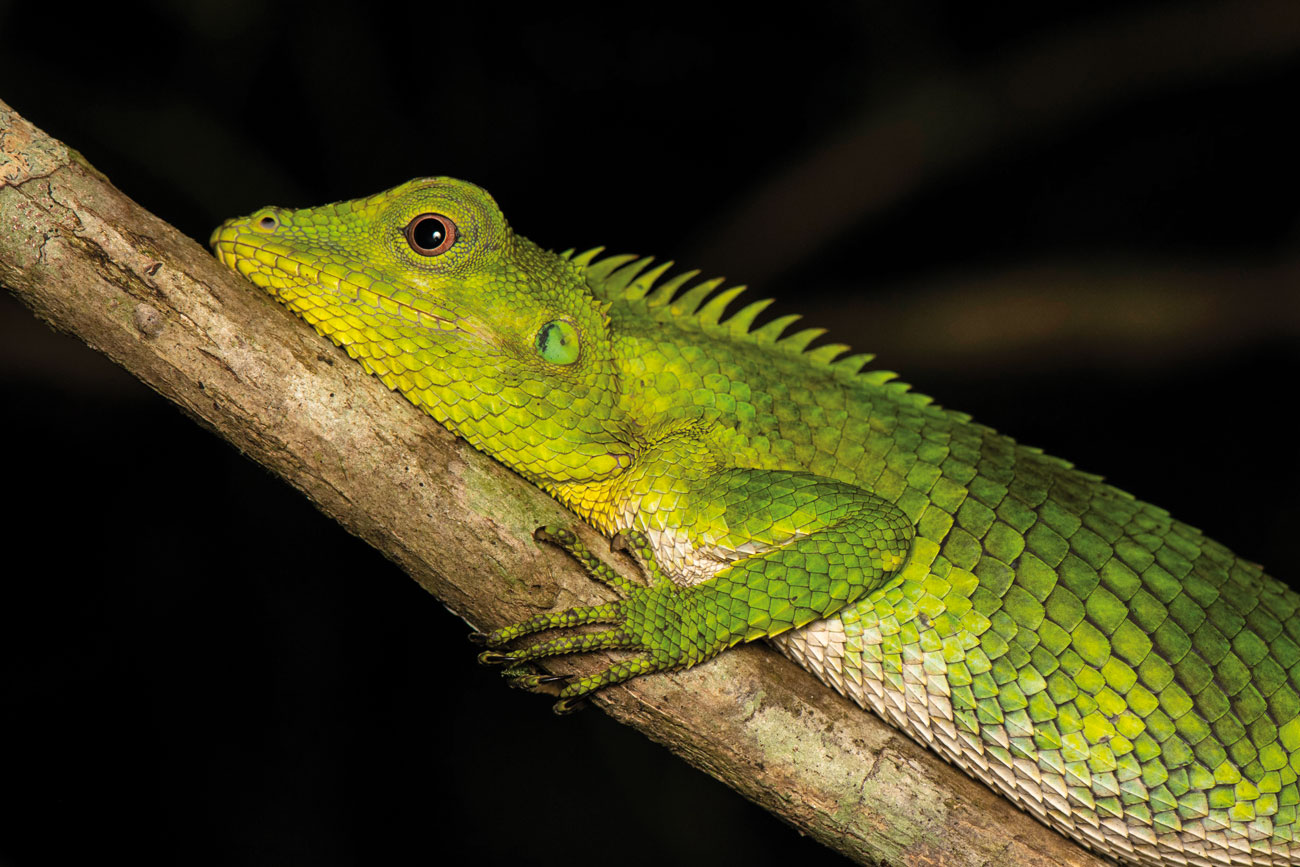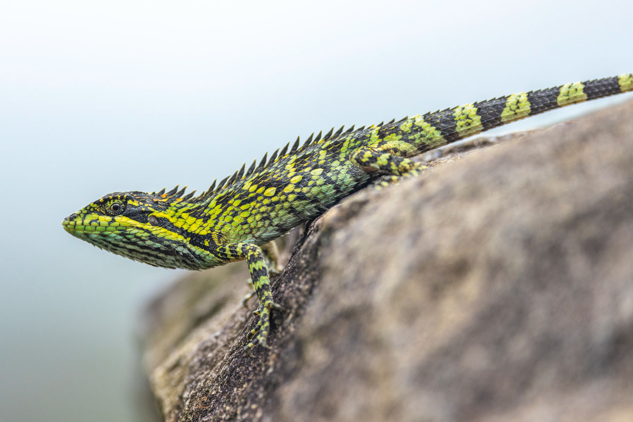 Nilgiri forest lizard Calotes nemoricola: An agile, tree-dwelling, and daylight-active agamid lizard, it is found mainly in the southern Western Ghats. This species thrives amidst the dense foliage, feeding on insects. When spotted resting on a twig, its prominent scales and spines along the back evoke in my mind images of a mythical dragon.
