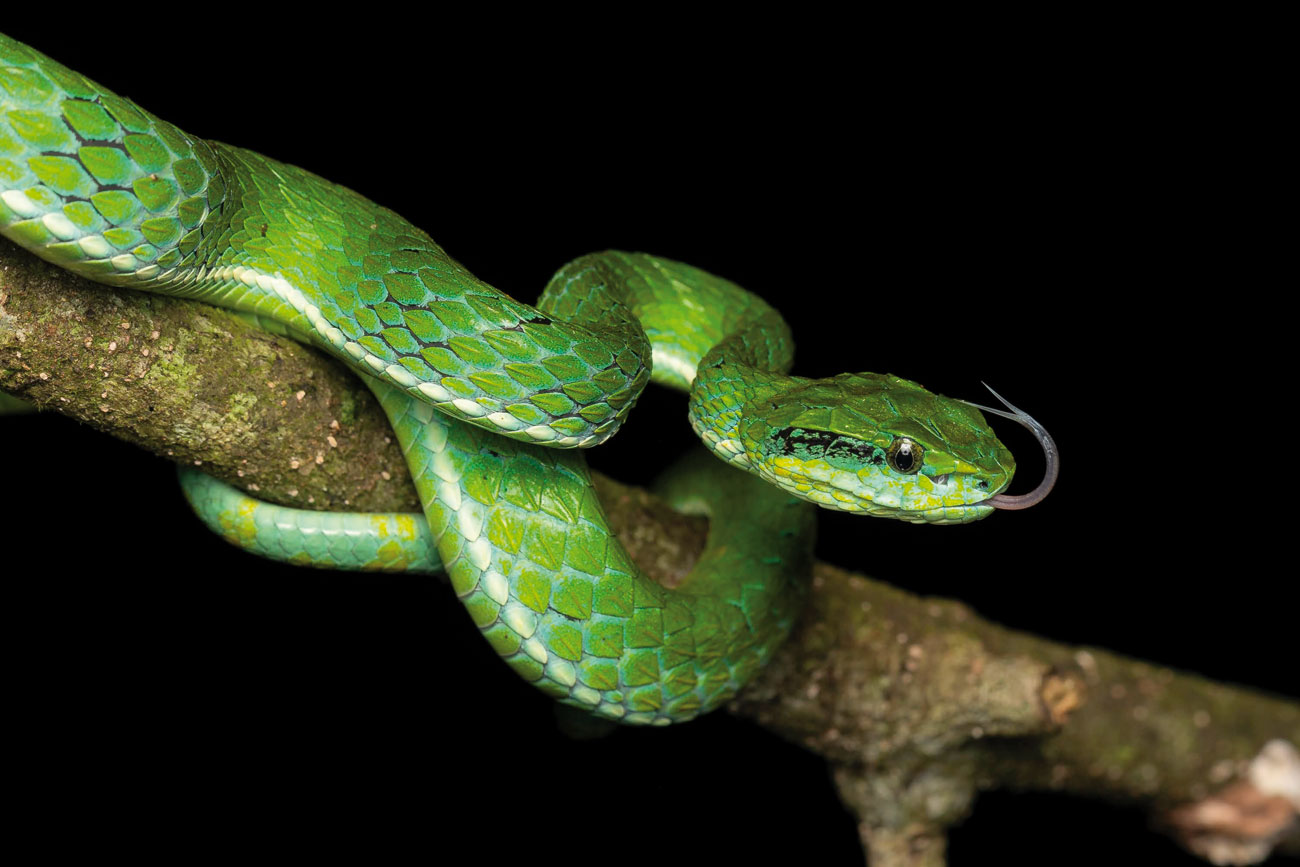 Large-scaled pit viper Craspedocephalus macrolepis: A venomous pit viper endemic to the Western Ghats south of the Palghat gap, it is a high-elevation specialist, commonly found 1,200 m. above sea level. It boasts a distinct bright green dorsum, adorned with patches of blackish skin between scales. Notably, a yellow or white stripe runs along each side of its body, following the first dorsal scale row. This striking snake flicks its forked tongue to navigate surroundings and gather essential chemical cues.