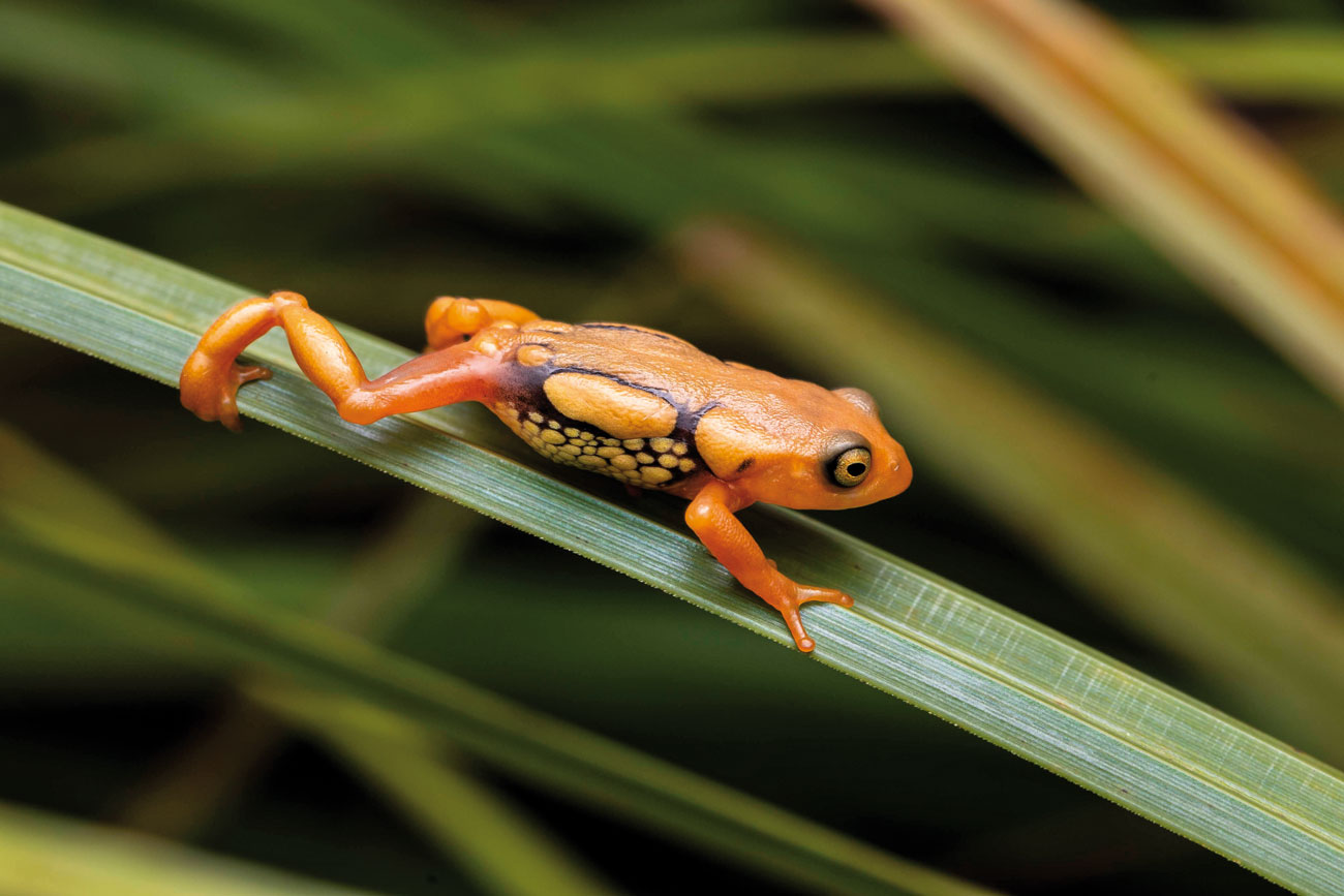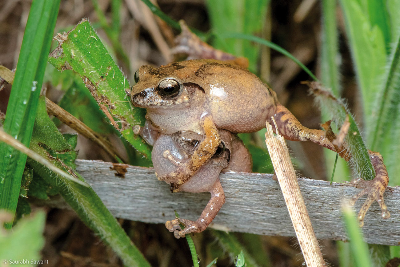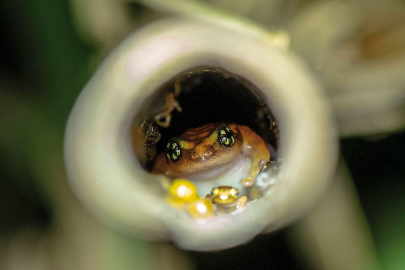 Ochlandrae shrub frog Raorchestes ochlandrae: While most frog species are not known for elaborate parental care behaviours, this Ochlandra frog, named after the Ochlandra reeds, defies this trend by nesting within reed hollows to protect eggs and hatchlings. The duo appeared to be using the same reed hollow for multiple egg-laying sessions throughout the season.