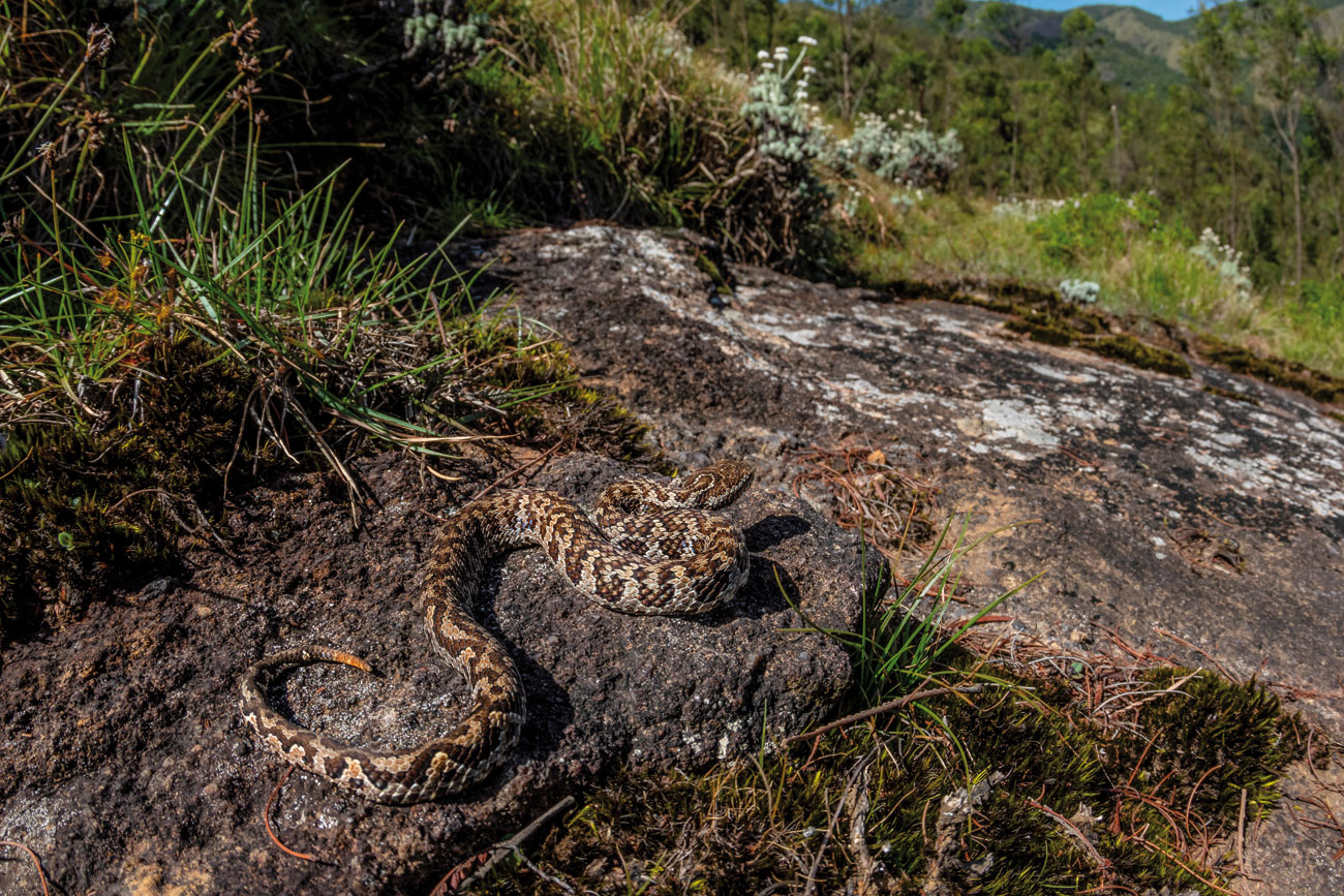 Horseshoe pit viper Craspedocephalus strigatus: This venomous snake, endemic to the Western Ghats of south India, is predominantly found in montane forests, shola patches, and grasslands, occupying altitudes ranging from 1,100 to 2,400 m. It is often sighted on the ground or rock formations and while it is suspected to be diurnal, its natural history remains enigmatic. Its diet consists of frogs, smaller snakes, and rodents such as mice. The intriguing name is inspired by the unique horseshoe-shaped mark or pattern often visible on its head.