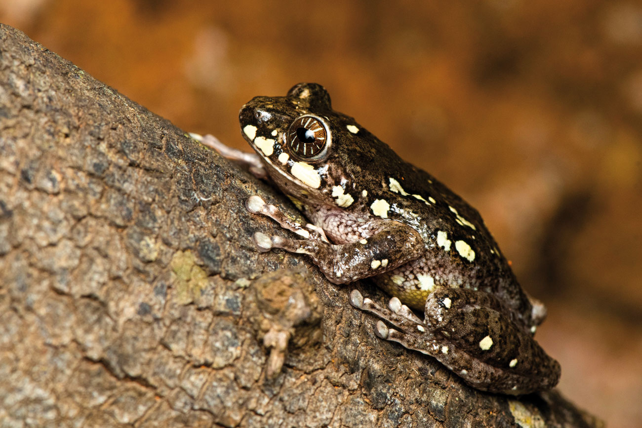 Cross-backed bush frog Raorchestes signatus: This endangered medium-sized frog is endemic to the Western Ghats, India. An arboreal species, it inhabits wet forests and shola areas. It is recognisable by its distinctive ‘X’ marking on a greyish-brown dorsum that gives it its name, and brown eyes with golden stripes. This frog faces habitat loss, necessitating its protection in this biodiverse region.