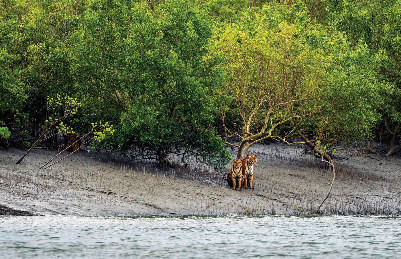 Through the sweltering heat, a tigress and her cub emerge through mangrove cover. Just like their stripes camouflage them in dry grasses, they also assist them in blending into mangrove roots and tiger palms. Photo: Vinit Bajpai.