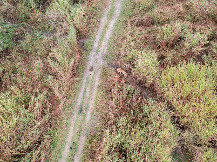<p>The aerial view of a golden jackal killed in the Panna Tiger Reserve in Madhya Pradesh makes for an unexpected, gloomy perspective. Captured using a drone camera in the summer of 2020, the photographer strikingly highlights the consequences of mindless linear development.</p>