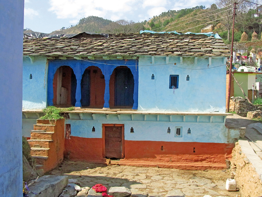 Families have shifted out of their older homes that are further up the hill (occasionally visited by the baagh) into ‘newer’ cement houses built closer to the access road. Situated on stepped terraces, old stone houses have the ground floor carved out of the hill, which is used for keeping domestic animals and storing grains, haystacks and water. The living spaces on the first floor have a wooden projection that overlooks the aangan and often opens into the winding pedestrian pathway.