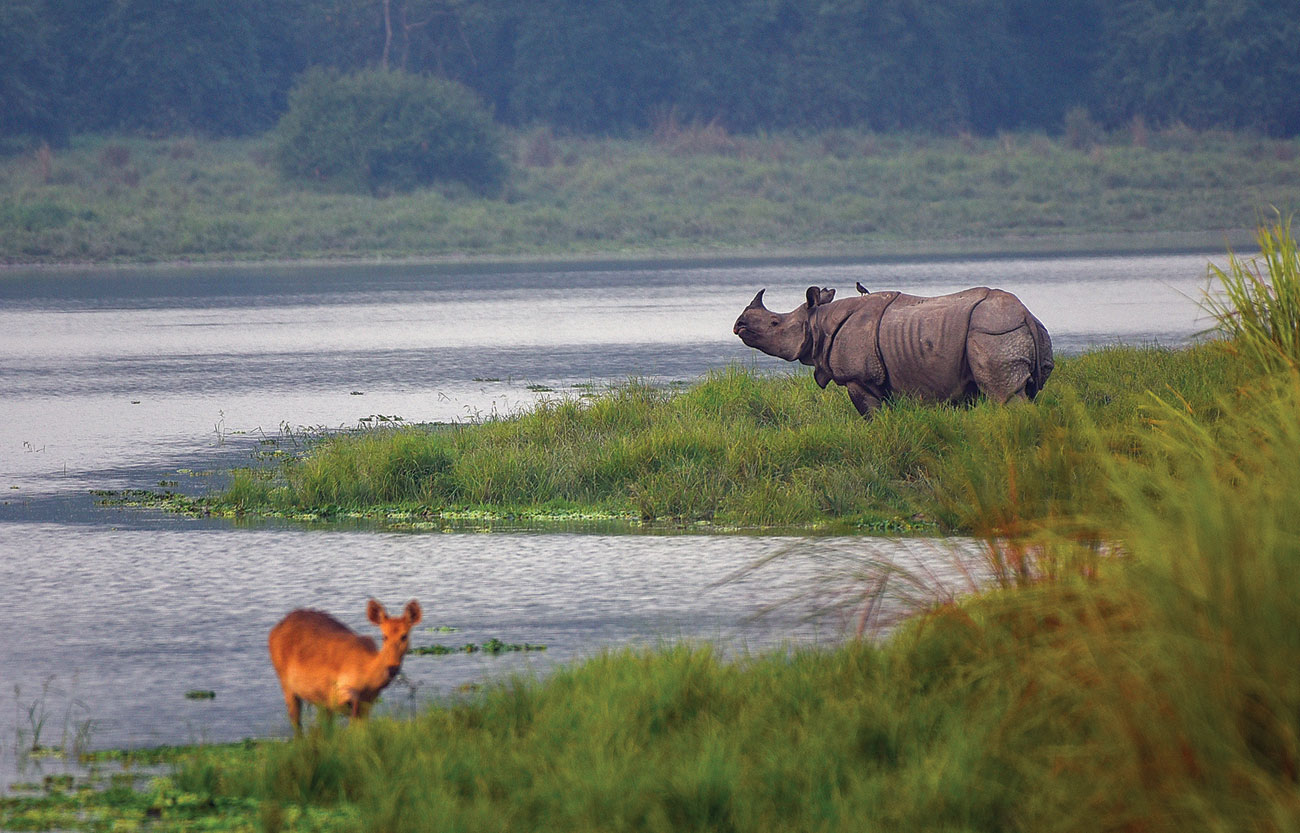 The Indian rhino and barasingha cross paths in the verdant Kaziranga landscape. Terai grasslands are moist, tall grasslands formed on the alluvium deposited by the meandering Himalayan rivers and maintained by cycles of flooding, fire and herbivory. Photo: Dr. Anish Andheria.