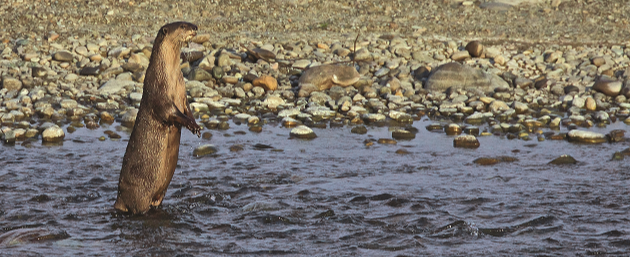 The Indian smooth-coated otter is characterised by its glistening, sleek pelage. It has a flattened tail and its limbs are strong and short, while the feet are large and webbed. It is generally described as a fish specialist and hunts in groups, travelling upstream in a V-formation while fishing. A small fish is swallowed whole while larger fish are taken to shore to eat at leisure. The otter is one of the very few aquatic mammals that does not have blubber to maintain body heat. An average otter must eat approximately 20 per cent of its body mass every day in order to maintain its high metabolic rate and keep itself warm. Otters play a vital role in the ecological balance of the Ramganga. Without otters to regulate prey populations, an overabundance of smaller animals and fish could result in depletion of other animals and plants in the food web, thus disrupting the balance of the whole river system.