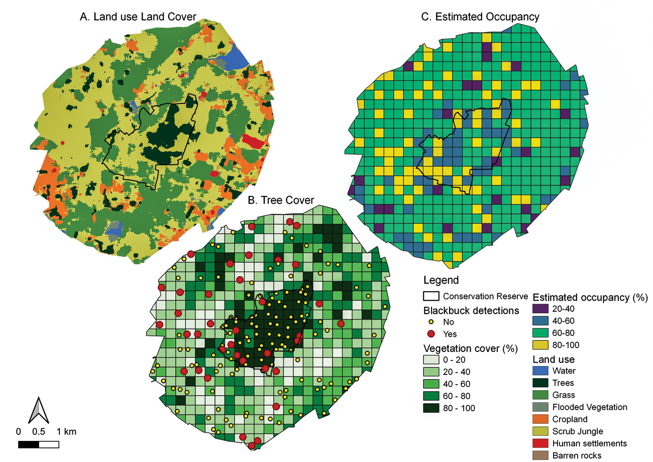 When we analysed the data using a robust statistical approach called ‘occupancy modelling’, we found that the likelihood of finding blackbuck was similar inside and outside the reserve. The probability of detecting blackbuck was dependent on the combination of the number of shrubs, trees, and presence of livestock. The probability of detection decreased with increasing shrubs, increased with presence of livestock, and did not vary with the number of trees. These were insightful findings as they showed how blackbuck use the landscape. Being open habitat species, shrubs such as Lantana and trees such as Neltuma juliflora create impenetrable habitats. The positive association with livestock is likely because both livestock and blackbuck are looking for grasses and other feeding resources. Although trees are not ideal in grassland habitats, we have observed blackbuck resting under the shade of trees, especially in the hot afternoons.
