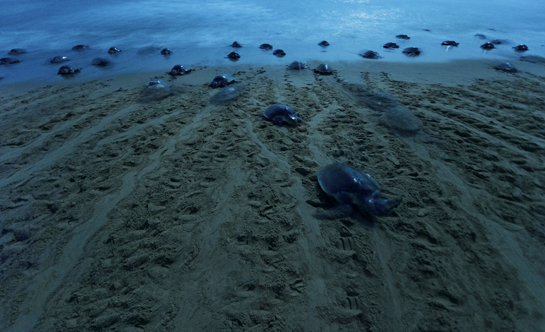 I have been blessed to have seen the remotest, and in my eyes, the finest parts of India. There are simply too many memories to recount. I cannot pick a favourite, but there is something special I would like to leave you with: a night spent on a remote beach in Odisha experiencing the arribada, the mass nesting of the olive ridley turtles. It was incredible: Thousands and thousands of turtles, their domed bodies glistening in the pale moonlight as they advanced on the beach - sometimes bumping into each other, in their entranced frenzy to find suitable nesting sites. Using their flippers, they laboriously excavated holes to lay their eggs. Ever so often, they would pause as if to take a breather and gather strength before continuing on their arduous task. Once the funnel-like hole - almost as deep as a bathing bucket - was ready, they dropped the eggs, like shiny, slippery table tennis balls, filled the nest with sand, carefully thumping their bodies, rocking from side to side, and secured their precious cargo. With a multitude of turtles employed in the task, the air filled with an earthy drumming sound. Legend says, and science agrees, that female turtles come back, to the natal beach, where they were born, to create new life.