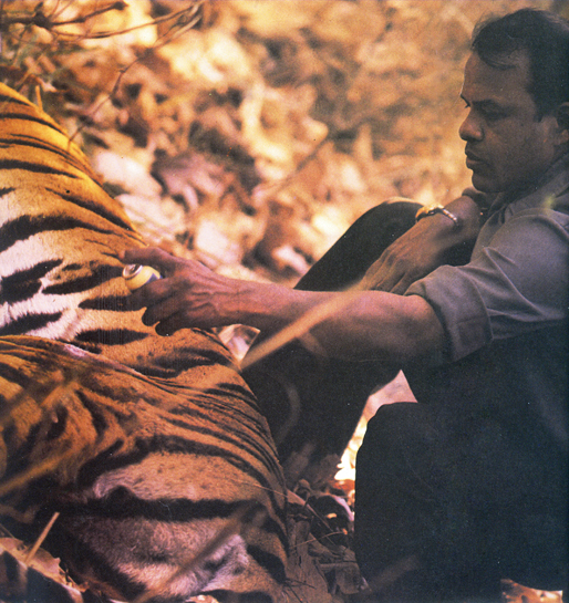 A ten-minute search enabled me to pick up the tracks once again, on the far bank some distance away, where the family had stopped by a shallow pool of water. Judging from the dampness of the pug-marks, the animals had left the pool less than half an hour ago. The sun was now almost directly overhead and I was bathed in perspiration, but I proceeded, nevertheless, for I was keen to see the cubs for myself. Manglu, a baiga tracker on whose jungle lore I had learned to rely, had told me the night before that one of the tigresses' three cubs looked weak and may not survive. I hoped he was wrong, and anyway, there was little we could do, as we had discovered long ago, that Natures ways are best not interfered with. Besides, even if we wanted to, separating the mother from the weak cubs was well nigh impossible.