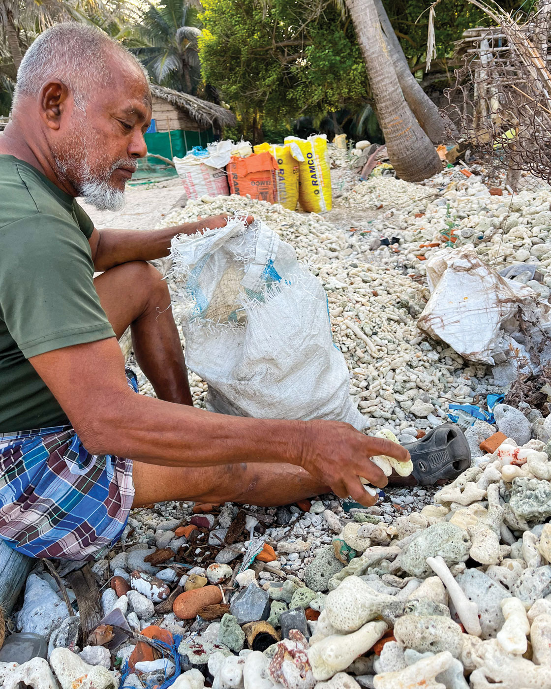 Walking along the beaches of Amini, one of the 10 habitable islands in the Lakshadweep archipelago, I noticed the elderly, especially men, filling sacks with coral rubble. Collected from across the coastline, the rubble is placed along eroded patches to breach the force of incoming waves and sustain the shores’ integrity.