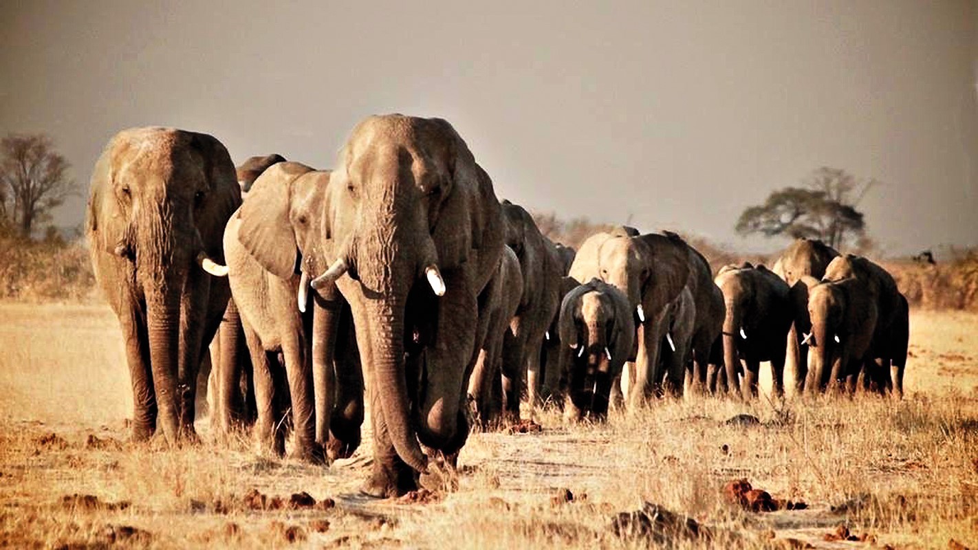 A herd of African elephants make their way across marshlands of the Savuti Reserve in Botswana, Africa.