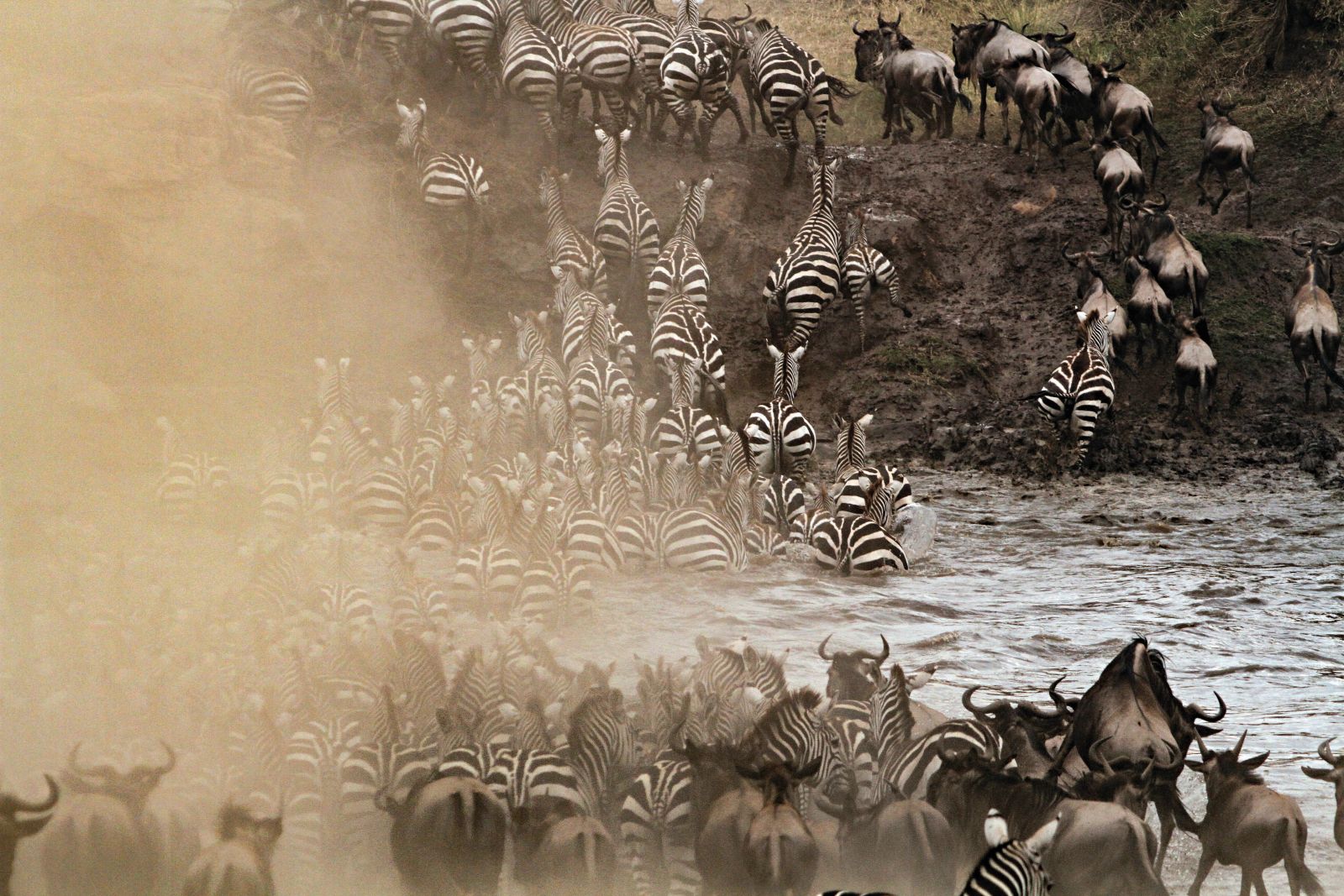 Thousands of zebras and wildebeest cross the dusty river crossing during the spectacular annual Great Migration in August in the Masai Mara National Reserve, Kenya.