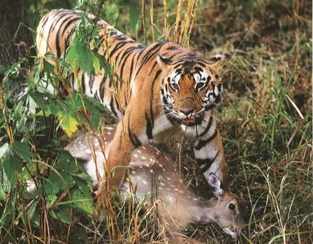In the meanwhile, urgent measures were required. I proposed in the next meeting of the State Wildlife Advisory Board held in Kanha itself, that the main objective of the management of Kanha was to save the barasingha, and everything else was subsidiary. This was accepted. The first thing was to stop the baiting of tigers at Schaller Hide, where George used to provide buffalo baits, then quite permissible, to study tigers. Subsequently, baiting continued and the site was a favourite point for visitors to view tigers. It was the haunt of the tigress Lunti, named after the first tiger I had ever seen in Dungarpur, Rajasthan, two decades earlier, and of her family of two large, playful cubs. I had spent many a happy hour watching this family from the hide and from the back of the exuberant elephant Pawanmala, playing hide and seek with the cubs, Pawanmala enjoying the game as much as the cubs, with the mother watching benignly without a growl. One full-moon and a bitterly cold night, the tigress and cubs lay beside the kill after a huge meal. Suddenly Lunti sat up and stared intently to the right of the hide. Following her gaze, I saw an apparition approaching. My binoculars clearly showed it was ‘Mussolini’, the resident alpha male, so named because his protruding jowls, surly temper and the habit of growling with neck characteristically thrust forward and upward, reminded me of the Italian dictator in his harangues. The cubs disappeared in the grass, Lunti turned over on her back, paws hanging limply. Musso went and sniffed her anal area and then went to the kill to feed. The tigress quietly got up and sat down between the feeding male and where the cubs had gone. Soon the cubs reappeared and sat on one side of the clearing, on their haunches. Whereupon Lunti went and parked herself again between the tiger and her cubs. Though Musso was the father of her cubs, Lunti was taking no chances.