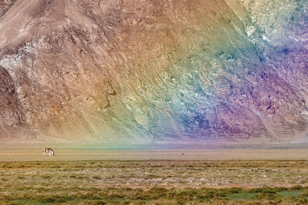 A Tibetan wild ass grazes in the high plateau of Hanle, Ladakh, flanked by rainobow-hued mountains. Poets, dancers, musicians and artists of all descriptions have forever been inspired by nature’s sights and sounds. Photo: Kavi Nanda/Sanctuary Photolibrary.