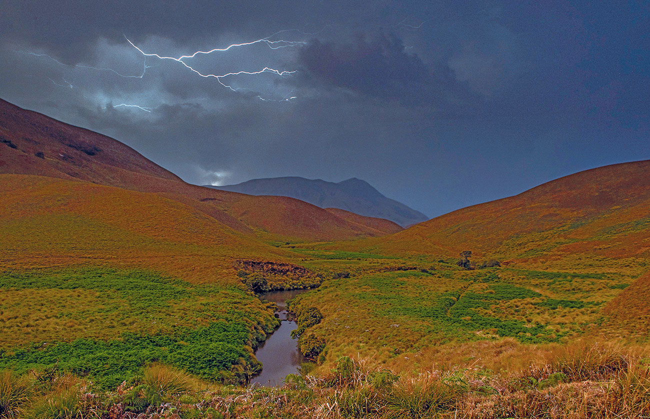 Lightning rents the sky in the Eravikulam National Park in Kerala and lights up the sholas. Nature is replete with visual and aural gems exemplified in Hindustani and Carnatic classical music with the six ragas. Photo: Salish J. Menachery/Sanctuary Photolibrary.