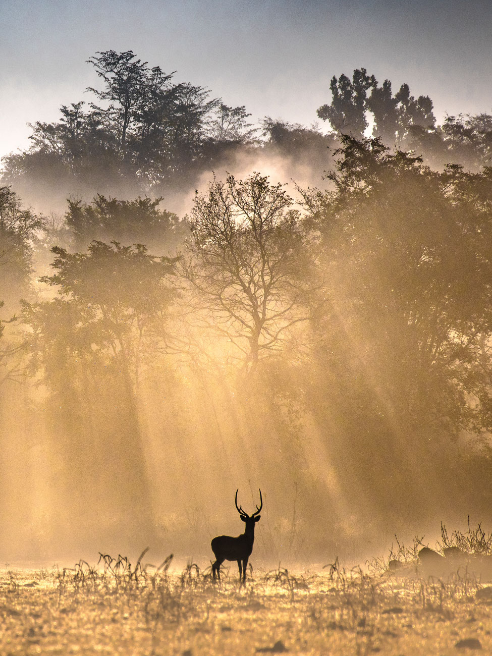 Ethereal dawn lights up the skies near Rajaji National Park while silhouetting a spotted deer stag. Rag Bhairavi epitomises dawn and is known as the queen of morning ragas. Photo: Trikansh Sharma/Sanctuary Photolibrary.