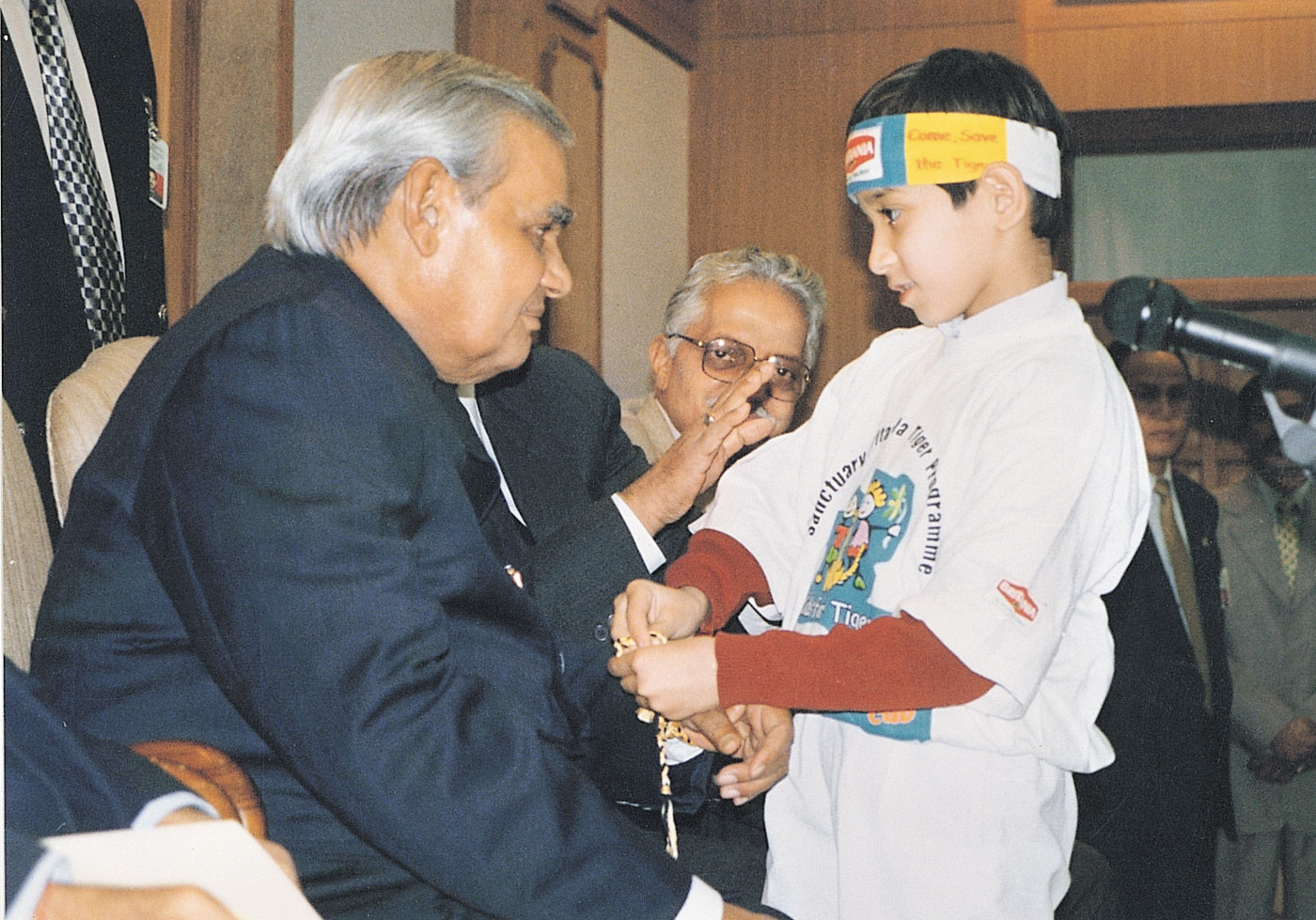 The Late Prime Minister Atal Bihari Vajpayee with a Kids for Tigers student. Sanctuary has been reaching out to children for a quarter century now to win their support for the protection of our biosphere. Photo: Sanctuary Photolibrary.