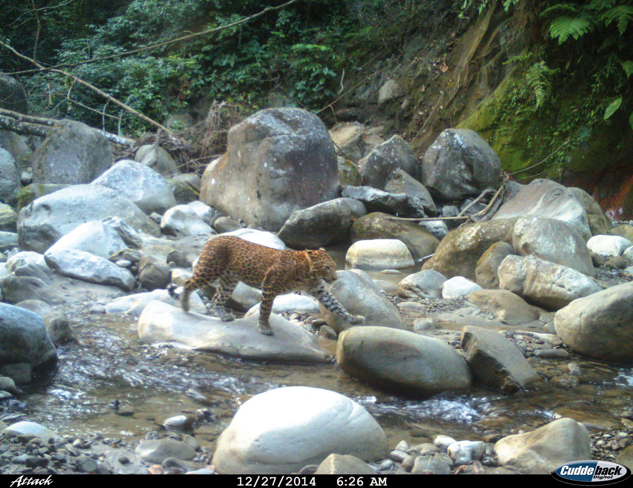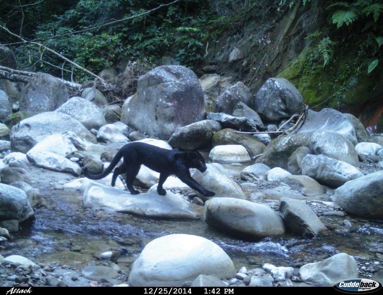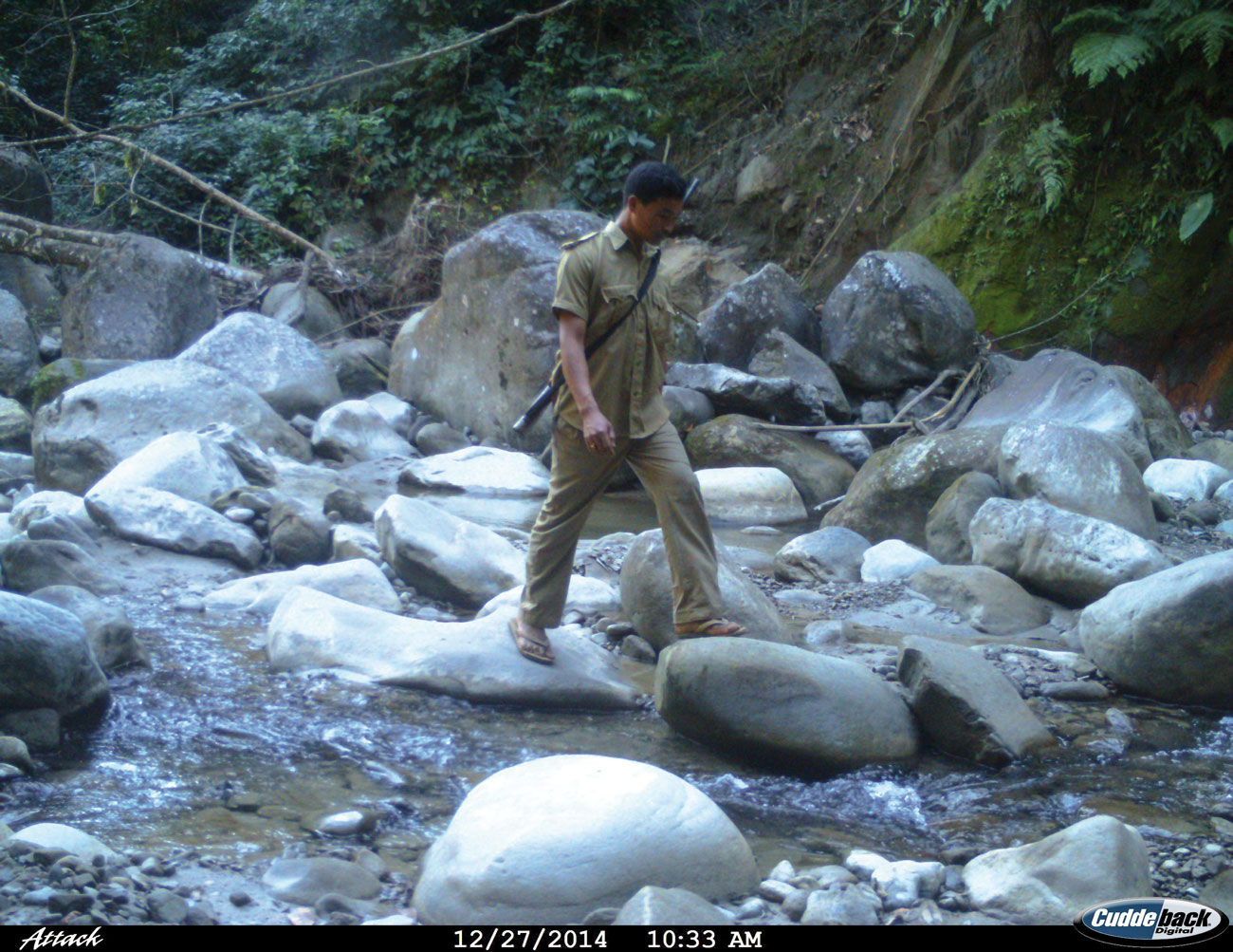 A melanistic leopard, Indian leopard and a forest guard were captured by the camera trap crossing the same stream at different times in the Pakke Tiger Reserve, which has high species diversity. It is the northern-most extent of rainforests of the world, and is at the cusp of the forested hills of Arunachal Pradesh and the Assam plains. Photo: Pakke Tiger Reserve Forest Department.