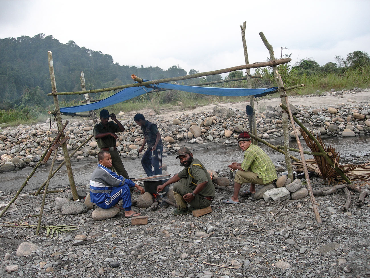 About sixteen years ago there were very few anti-poaching camps; staff and researchers usually stayed in outdoor kitchens as seen here. The setting up of camps and patrolling routes was initiated by Arunachali field-based officers such as Tana Tapi and Chuku Loma who stayed in the forest and in such camps along with their staff. Seen in the picture here is P.D. Majhi who was later killed by poachers. Photo: Tana Tapi.