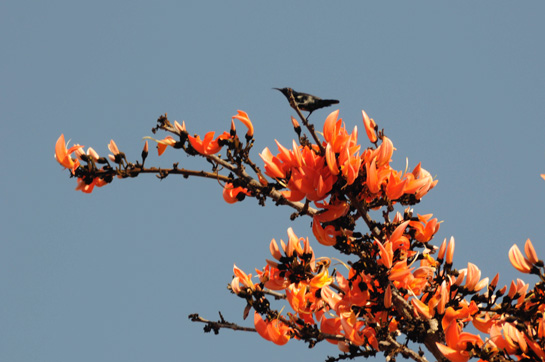 On the 31st morning, we did not go for the morning ride. We left Nagarahole at 8.30 a.m. so as to sight some avifauna on our way to Murgal and beyond to Coimbatore. Luckily for us some avifaunal surprises were there! We first came across a Red Jungle Fowl. Its swift movement has always been intriguing to a wildlife photographer. But this time, I could successfully get it in my camera. On either side of the road the birds chirping aroused forest activity to its crescendo. They were mostly flitting about through branches and foliage. A small Green Beeeater perching on a projecting twig was well documented by my grandson. A little yonder from this place was a Red Wattled Lapwing moving slowly on the forest floor which made for good pictures. After this, when we thought it was time to drive off, when I suddenly noticed a tree completely denuded of its foliage but bearing red flowers all over, which were glistening in the sunlight. This tree was none other than the flame of the forest Butea monosperma.