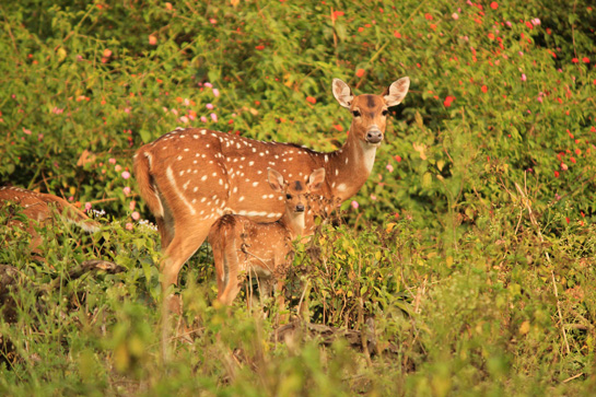 At 3.30 pm, we started exploring the tourist zone of the forest by gypsy. The highlight of this trip was sighting well-grown sambar looking like over-sized ponies. The first one we sighted was a black stag nibbling at the greenery of the hedge to our left. On the underside of its neck, the red or sometimes pinkish spot was visible. Three huge female sambar were trotting close by along the hedge together. Their characteristic sound at the sight of the gypsy seemed like an alarm call. After clicking some images, we reversed the vehicle, and we were keeping pace with their movement. They suddenly crossed the road and took their position on the path of the vehicle as if they were policemen stopping the vehicle! A rare pose indeed! But this moment could not be captured on our cameras for, within split seconds they jumped to the opposite side of the road. Another event of photographic value in this stretch was a small herd of grazing chital juxtaposed by a boar which was gnawing the forest floor for tubers against the backdrop of reflections of nearby trees on the waters of a pond.