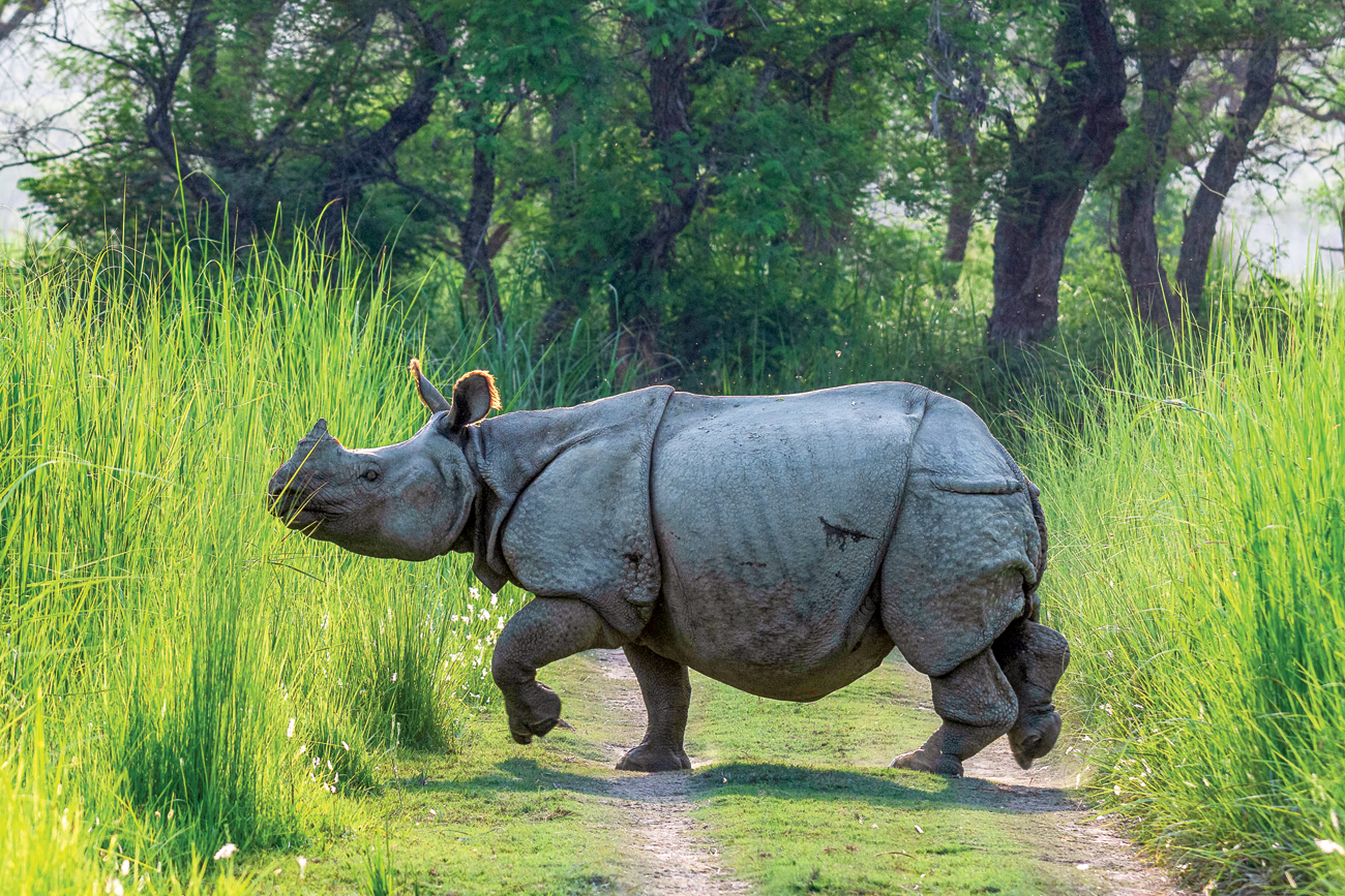 As dawn breaks, a soft gold seeps across its vast grasslands. The morning air trembles with the chatter of passerines, and on rare, fortunate days, a tiger pads out of tall grasses in search of prey. The tall Terai grasses, locally known as phantas, cradle entire worlds: hog deer carefully picking their way through the undergrowth, swamp deer browsing in small herds, and chital darting in and out of sight. Greater one-horned rhinos graze in these grasslands, leaving wide swathes of flattened vegetation in their wake.
