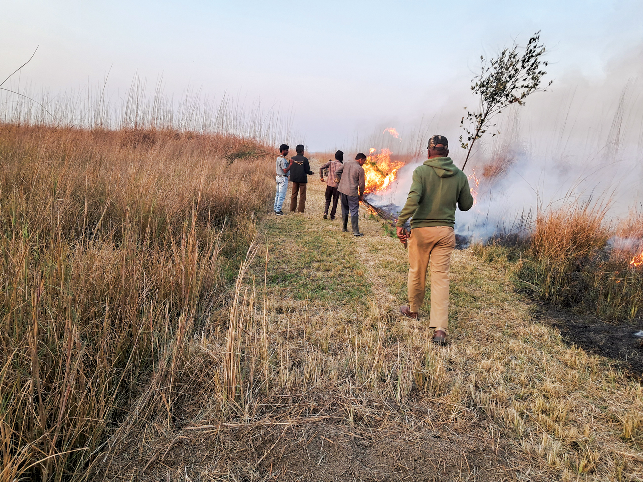 A controlled slash burning technique is used to remove invasive species. Over the past five years, WWF-India has supported an initiative to protect and restore the grasslands of the Dudhwa Tiger Reserve. The project focuses on plot-based restoration of grassland habitats. Photo: Somreet Bhattacharya.