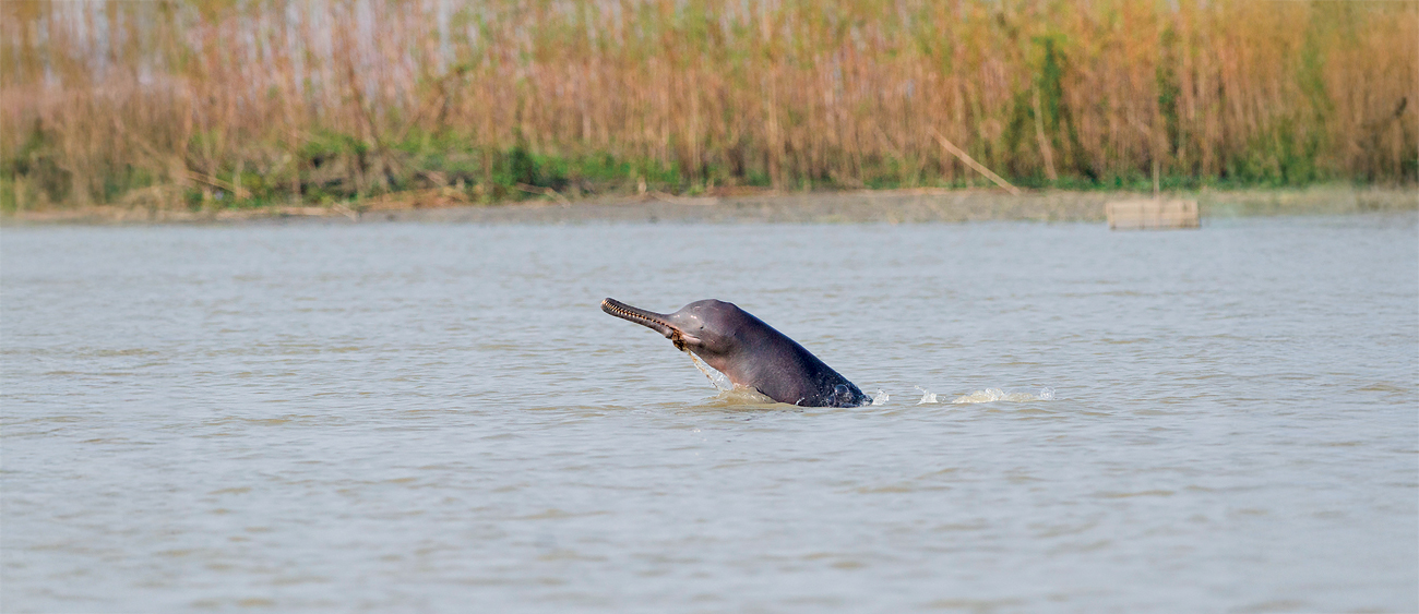 In the stillness of the river, the Ganges river dolphin emerges – an ancient inhabitant of Indian rivers. This remarkable, nearly blind creature once thrived in great numbers across the Ganga-Brahmaputra-Meghna system. Photo: Soumen Bakshi/Sanctuary Photolibrary.